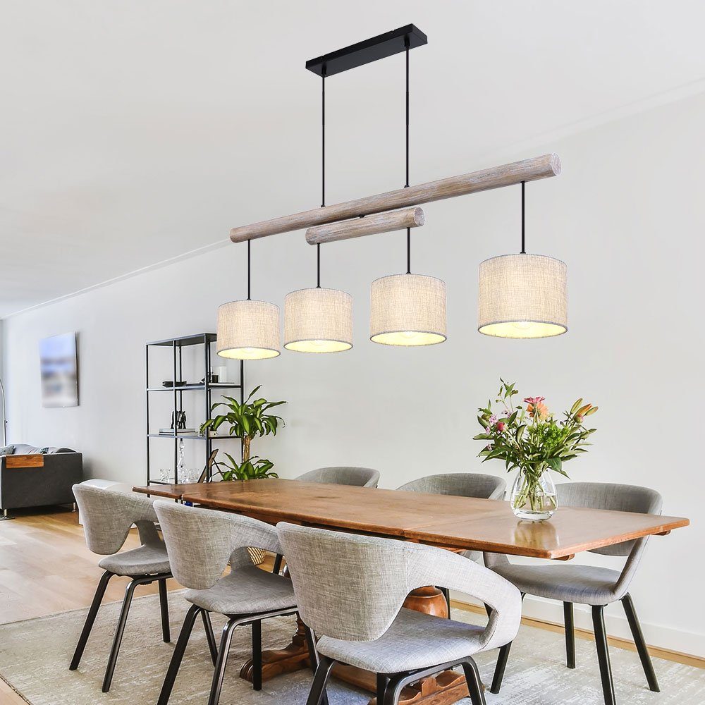 Die 113 cm lange Hängeleuchte besteht aus einem Holzstab, der an zwei schwarzen Kabeln von der Decke hängt und außen jeweils mit einem grauen Textilschirm versehen ist. In der Mitte ist ein kürzerer Holzstab fixiert, an dem zwei weitere Textilschirme hängen. Die Höhe der Leuchte können Sie bei der Montage auf bis zu 120 cm anpassen. Außerdem können Sie die Textilschirme mit E27-Leuchtmitteln Ihrer Wahl bestücken, wodurch Sie die Möglichkeit haben, Lichtfarbe und Helligkeit nach Ihren Vorstellungen bestimmen können.