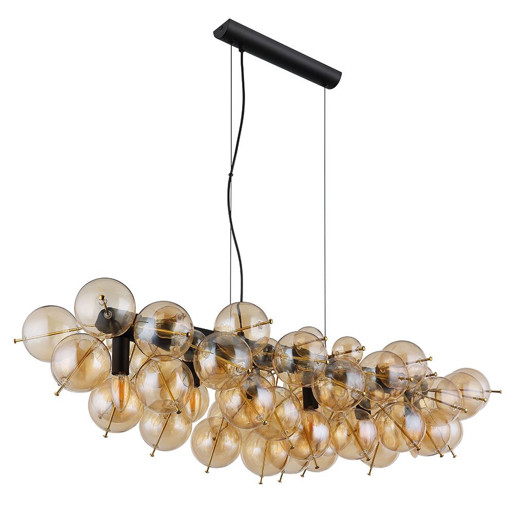 Die UDO Hängeleuchte bietet eine einzigartige Kombination aus Design und Licht. Die langgezogene Schiene mit gerade Balken ist auf beiden Seiten mit Stäben versehen, die mit unterschiedlich großen Kugeln bestückt sind. Diese einzigartige Konstruktion erzeugt eine einzigartige Optik, die den Raum beleuchtet. Die Hängeleuchte wird durch den Korpus aus schwarzem, matt lackiertem Metall und das metallische Gesicht aus goldfarben lackiertem Metall bestimmt. Die Schirme bestehen aus Glaskugeln in einem warmen, amber-farbenen Finish, die eine wunderbare Beleuchtung erzeugen. Die UDO Hängeleuchte ist eine ideale Wahl für alle, die nach einer einzigartigen und stilvollen Lösung für ihre Beleuchtung suchen. Mit ihrer einzigartigen Form und ihrem wunderschönen Design wird sie jeden Raum zum Zentrum der Aufmerksamkeit machen.
