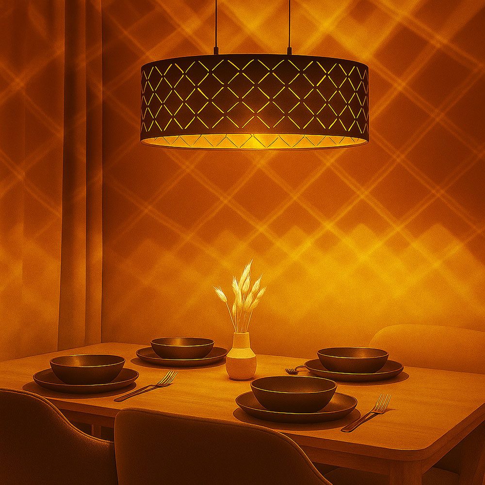 Diese moderne Hängeleuchte beeindruckt durch ihr harmonisches Zusammenspiel aus hochwertigen Materialien, edlem Farbkontrast und funktionaler Gestaltung. Der schwarze Textilschirm mit goldfarbenem Innenleben und dekorativen Stanzungen sorgt für eine effektvolle Lichtverteilung mit warmem Schein. Das matte Nickelgestell ergänzt das Design stilvoll und verleiht der Leuchte einen modernen Look.