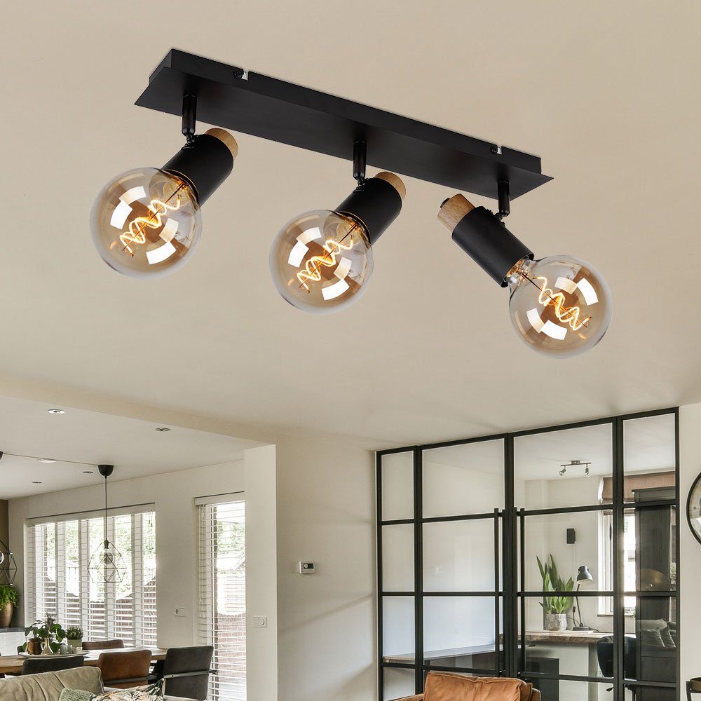 Dieser schöne Strahler begeistert durch schlichtes Design. Aus einer schwarz matten rechteckigen Deckenbefestigung (8x48,5cm) ragen drei drehbare Gelenke. An diesen befinden sich drei E27 Fassungen mit tollen Verzierungen in Holz und Metall. Die E27 Fassungen ermöglichen Ihnen bis zu einer maximalen Leistung von 40 Watt, selbst über Lichtfarbe und Helligkeit zu entscheiden. Aufgrund ihrer Langlebigkeit und Stromersparnis empfehlen wir LED Leuchtmittel.