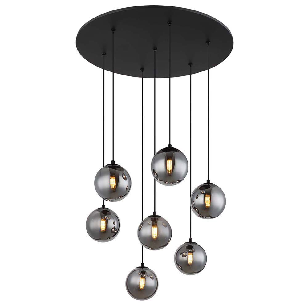 Die RIHA Hängeleuchte ist ein einzigartiges Lichtobjekt, das durch sein rundes Design und 7 Hänger mit rauchfarbenen Glaskugeln bestimmt wird. Der Korpus der Leuchte besteht aus schwarz lackiertem Metall, das eine matte Oberfläche aufweist. Die rauchfarbenen Glaskugeln schaffen eine besondere Atmosphäre und sorgen für eine einzigartige Beleuchtung. Die Abmessungen der RIHA Hängeleuchte sind ø 550 mm, was sie zu einer idealen Lösung für mittelgroße Räume macht. Mit einem effektiven Lichtoutput von 130 Lumen bei einer Farbtemperatur von 3000 K bietet die RIHA Hängeleuchte eine angenehme Beleuchtung. Durch ihre minimalistische Gestaltung und die eleganten Glaskugeln wird die RIHA Hängeleuchte zu einem stilvollen Accessoire für jede Raumgestaltung.