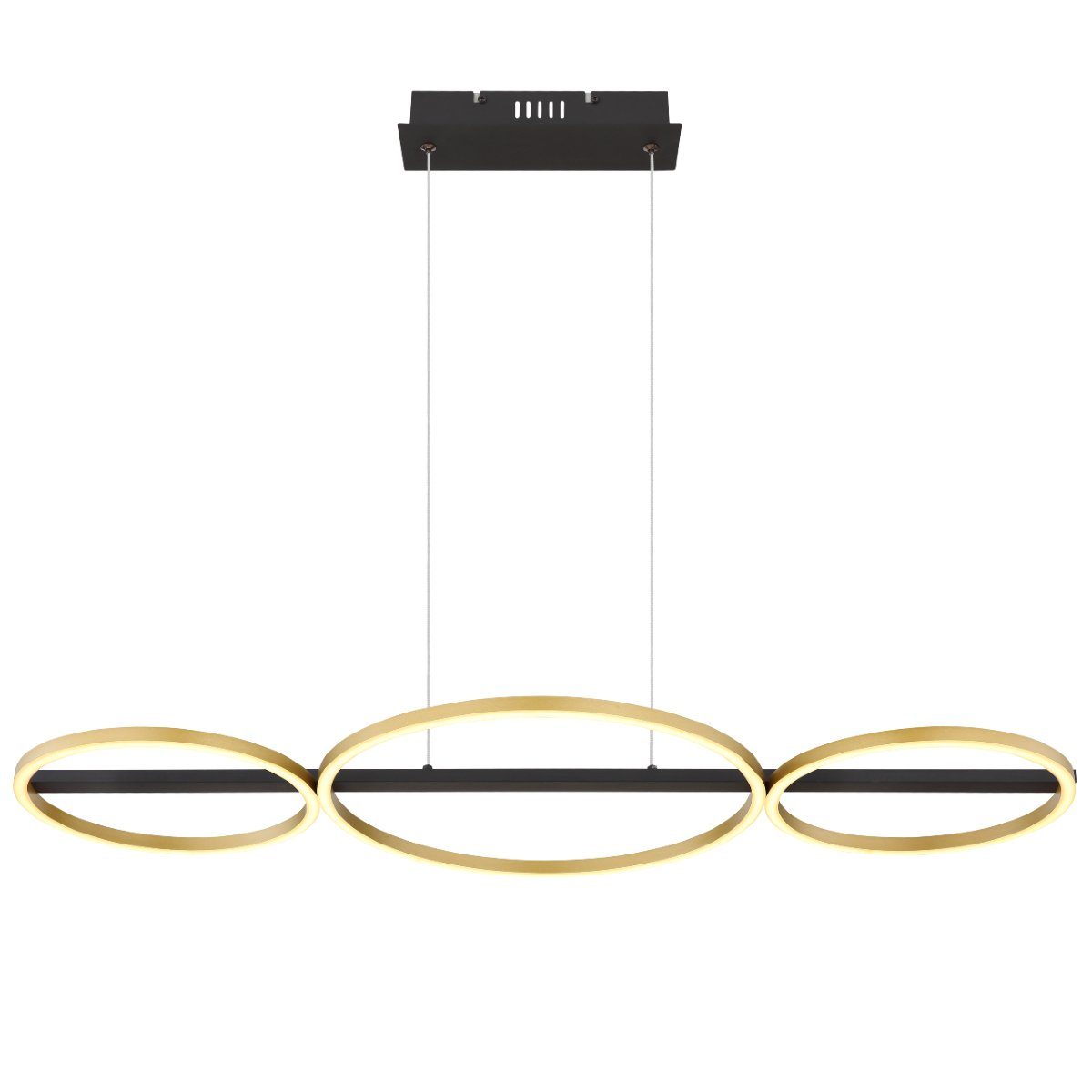 Die Pendelleuchte präsentiert sich mit einem großen Ring in der Mitte, der einen Durchmesser von 39 cm aufweist, flankiert von zwei kleineren Ringen mit je 27 cm. Die schwarze Halterung der Leuchte bildet einen geschmackvollen Kontrast zu den kreisrunden Leuchtbändern in Gold. Dank des angebrachten Diffusors gewährleistet sie eine gleichmäßige Lichtstreuung und eine gemütliche Beleuchtung. Sie besitzt eine maximale Höhe von 120 cm, die Sie bei der Montage bei Bedarf kürzen können.