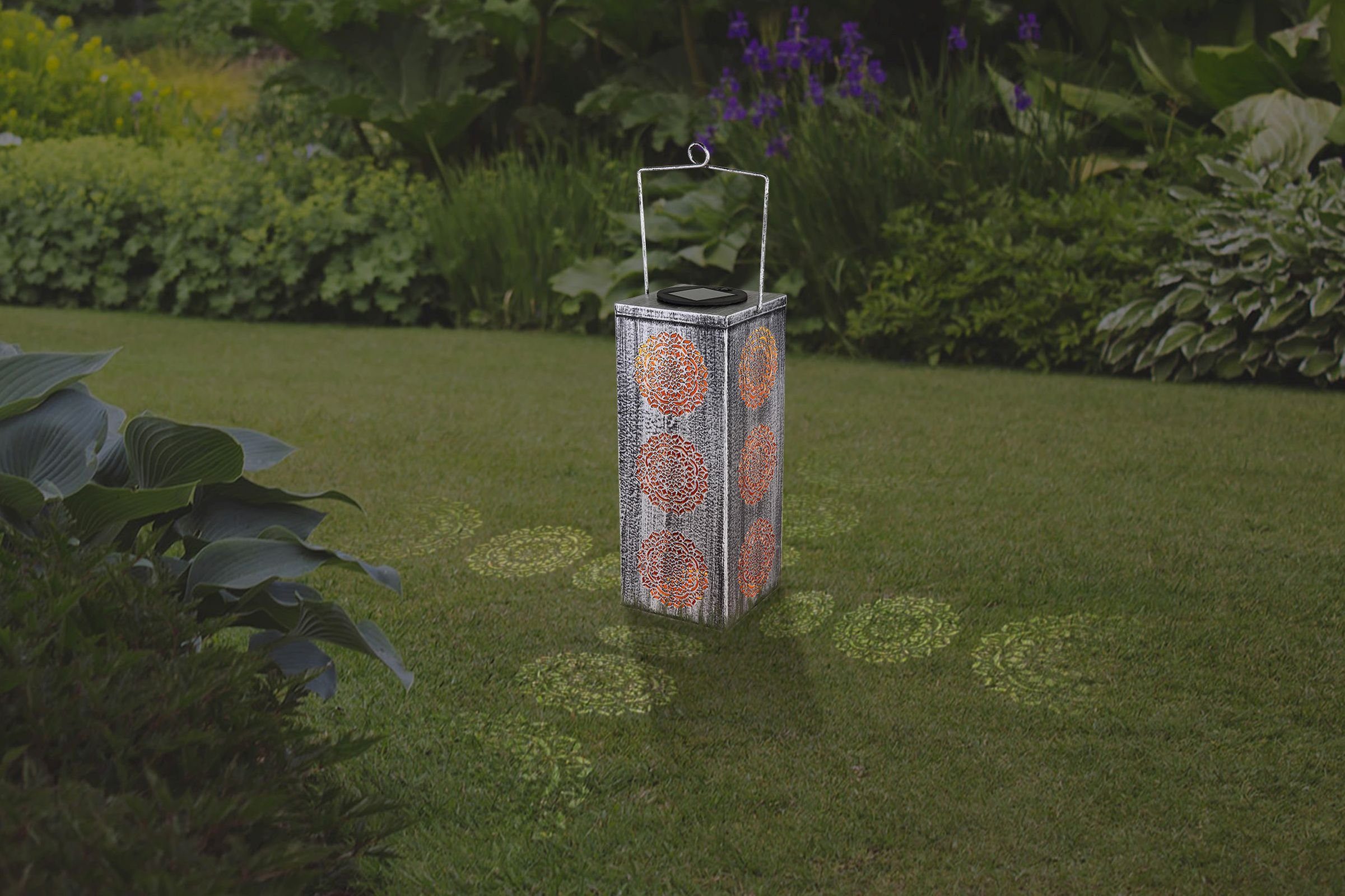 In eingeschaltetem Zustand wird das Licht durch das kunstvoll gearbeitete Muster gestreut und verspricht eine magische Lichtstimmung in ihrem Garten. Die LED-Solarleuchte fügt sich ideal im Vorgarten, auf der Terrasse oder auf dem Balkon ins Ambiente ein.