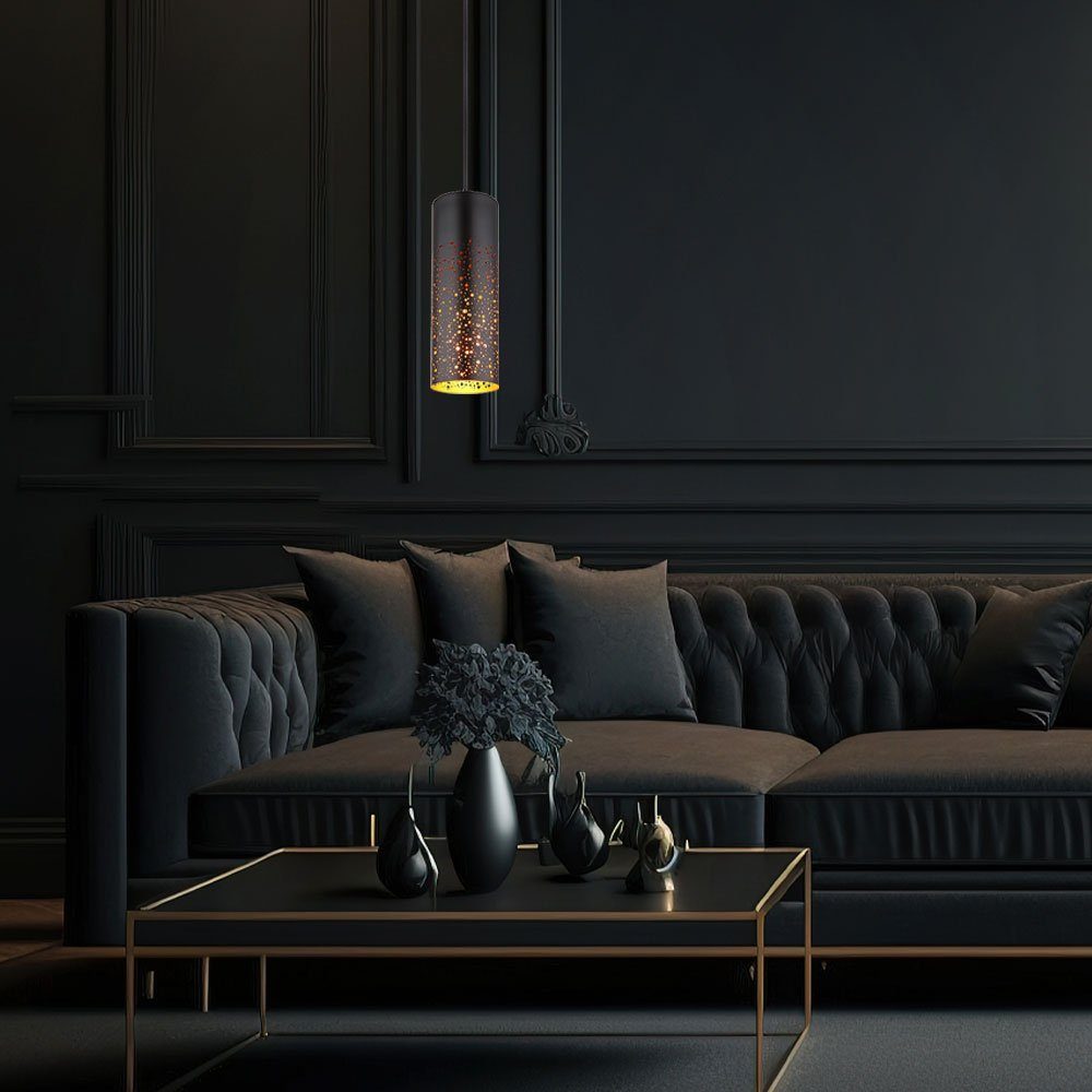 Diese Hängeleuchte der CROCKY-Serie besteht aus schwarzem Metall und einem zylinderförmigen Glas mit Dekorstanzungen (Ø 10 cm). Aus einer runden Deckenbefestigung ragt ein 1,5 m langes Kabel, welches an einer E27 Fassung mit einem formschönen Schirm mündet. Die E27 Fassung ermöglicht Ihnen, bis zu einer maximalen Leistung von 40 Watt, selbst über Lichtfarbe und Helligkeit zu bestimmen. Aufgrund von Langlebigkeit und Stromersparnis empfehlen wir LED Leuchtmittel