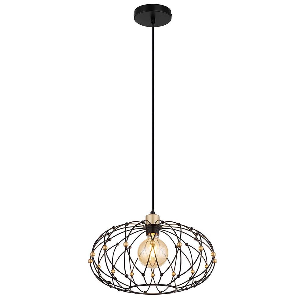 Diese Pendelleuchte kombiniert modernes Design mit einem Hauch von Vintage und Industrial-Charme. Der offene Schirm besteht aus einem fein gearbeiteten schwarzen Metallgeflecht, das von dekorativen goldfarbenen Kugeln durchzogen ist. Diese stilvolle Gestaltung erzeugt ein einzigartiges Lichtspiel und macht die Leuchte zu einem visuellen Highlight in jedem Raum. Mit einem Durchmesser von 40 cm und einer maximalen Höhe von 150 cm eignet sich die Pendelleuchte ideal zur Platzierung über Esstischen, in Wohnbereichen oder als Statement-Piece im Flur. Dank des individuell kürzbaren Kabels kann die Höhe flexibel angepasst werden. Die Leuchte ist mit einer E27-Fassung ausgestattet und für Leuchtmittel bis 40 Watt ausgelegt. So lässt sich je nach Wunsch eine warme oder neutralweiße Lichtstimmung schaffen. Ob modern, retro oder industriell – diese Leuchte passt sich vielseitigen Einrichtungsstilen an und verleiht dem Raum einen exklusiven Charakter.