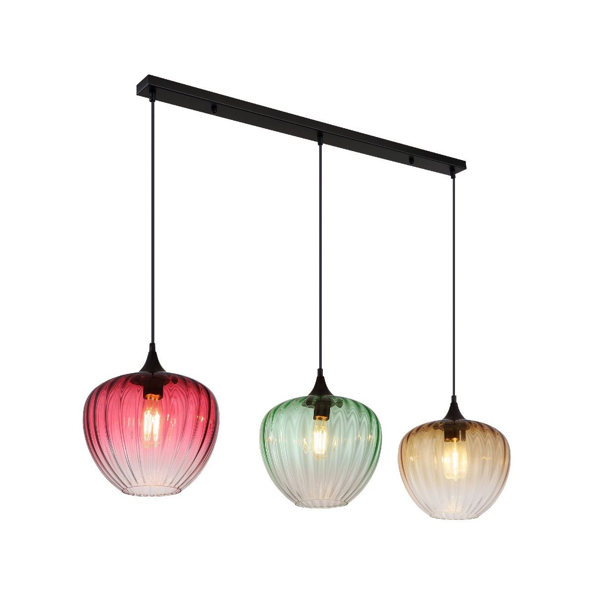 Die Pendelleuchte Solveig fasziniert mit drei Glasschirmen in den warmen Tönen Amber, Rot und Grün, die sanft in klares Glas übergehen. Das gerillte Glas sorgt für eine interessante Lichtbrechung und schafft eine behagliche Atmosphäre, die jedem Raum einen Hauch von Vintage verleiht.