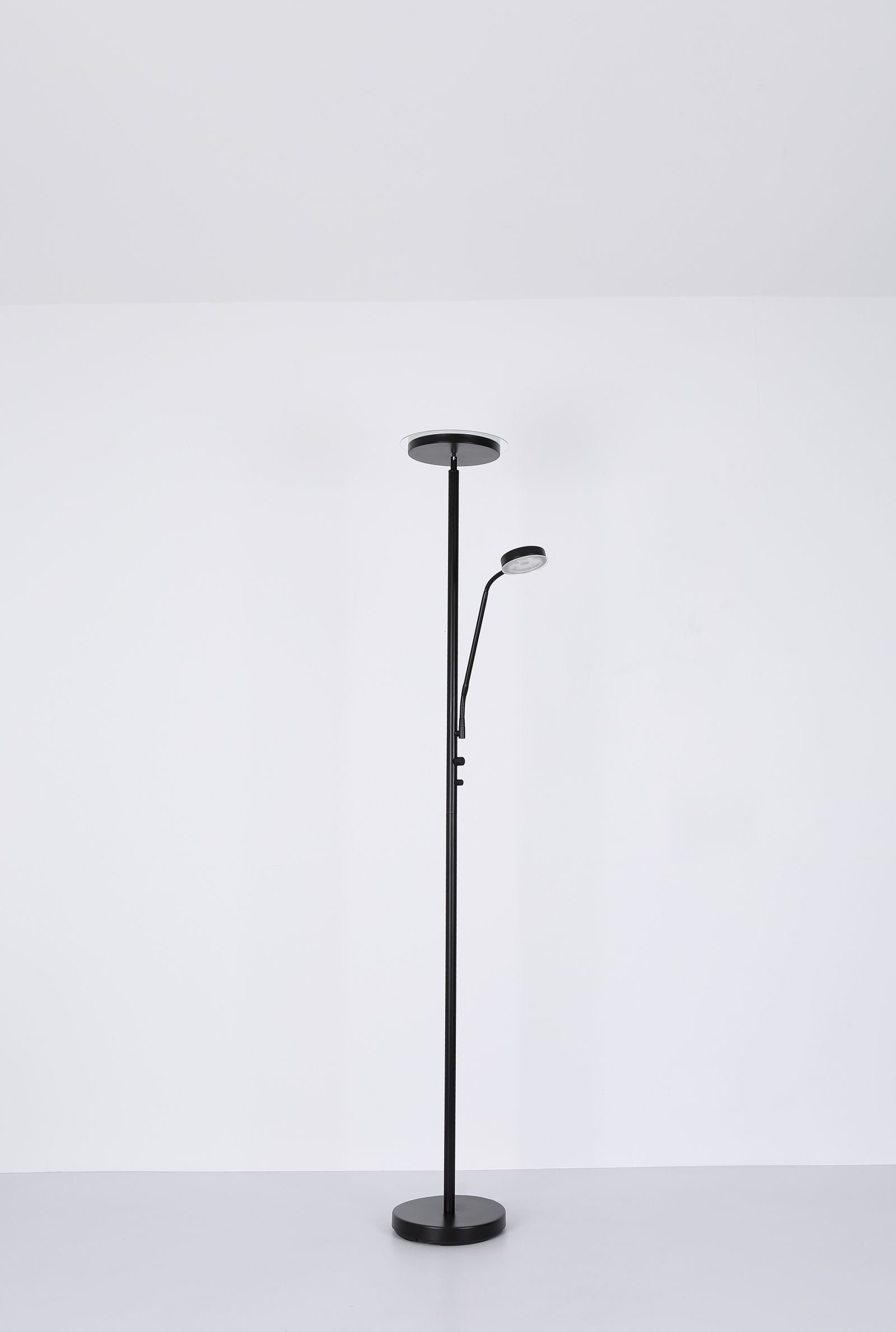 Die Stehlampe besteht aus einem runden Sockel, an dem ein Metallstab fixiert ist. Dieser ist an der Spitze mit einer runden Platte versehen, welche mit von opalenem Glas bedeckte LED-Leuchtmittel ausgestattet ist. Zudem ist an dem Metallstab eine biegsame Stange fixiert, die ebenfalls über eine etwas kleinere Metallplatte mit LEDs verfügt.