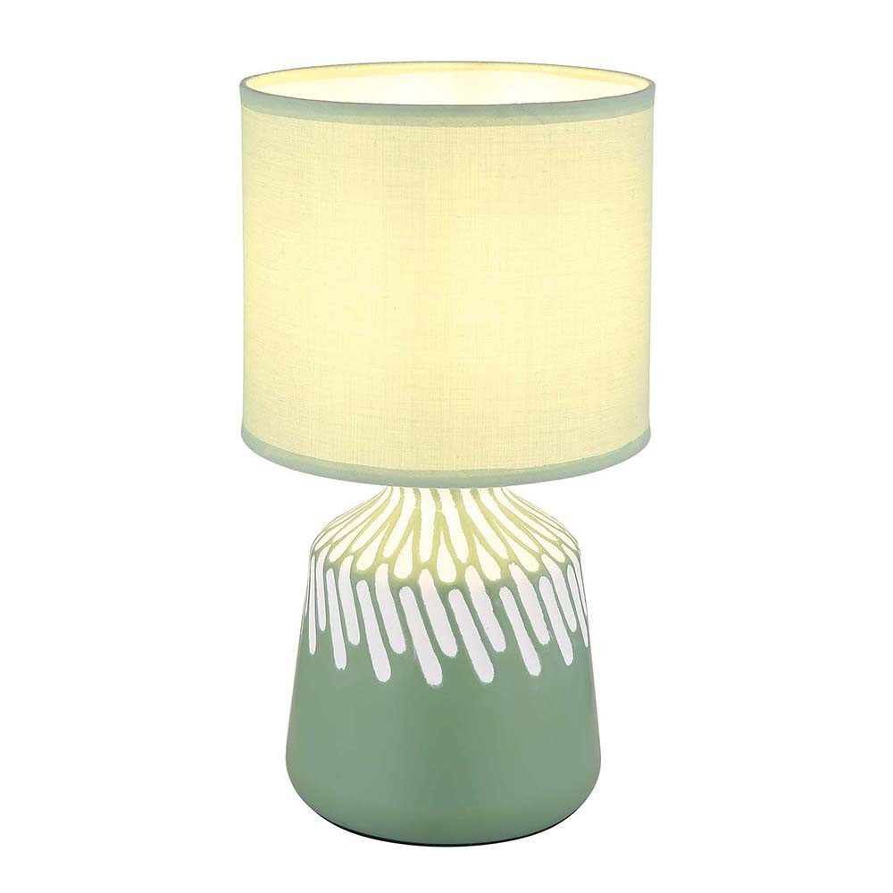 Die Tischleuchte RELA ist ein stilvolles Highlight für jede Einrichtung. Ihr runder Sockel mit kunstvollem Dekor bildet die Basis für den zylindrischen Stoffschirm, der in sanftem blassgrün gehalten ist. Diese Kombination aus Keramik und Textil verleiht der Leuchte eine elegante, zeitlose Ästhetik. Der Korpus aus blassgrüner Keramik harmoniert perfekt mit dem Textilschirm und sorgt für ein harmonisches Gesamtbild. Die Leuchte verfügt über einen praktischen Wippschalter am Kabel, der eine einfache Bedienung ermöglicht. Mit einem Durchmesser von 175 mm ist die RELA Tischleuchte kompakt genug, um sich mühelos in verschiedenste Räume einzufügen, während die E14-Fassung Flexibilität bei der Wahl der passenden Leuchtmittel bietet. Ideal für jeden Raum, in dem Funktionalität auf stilvolles Design trifft.