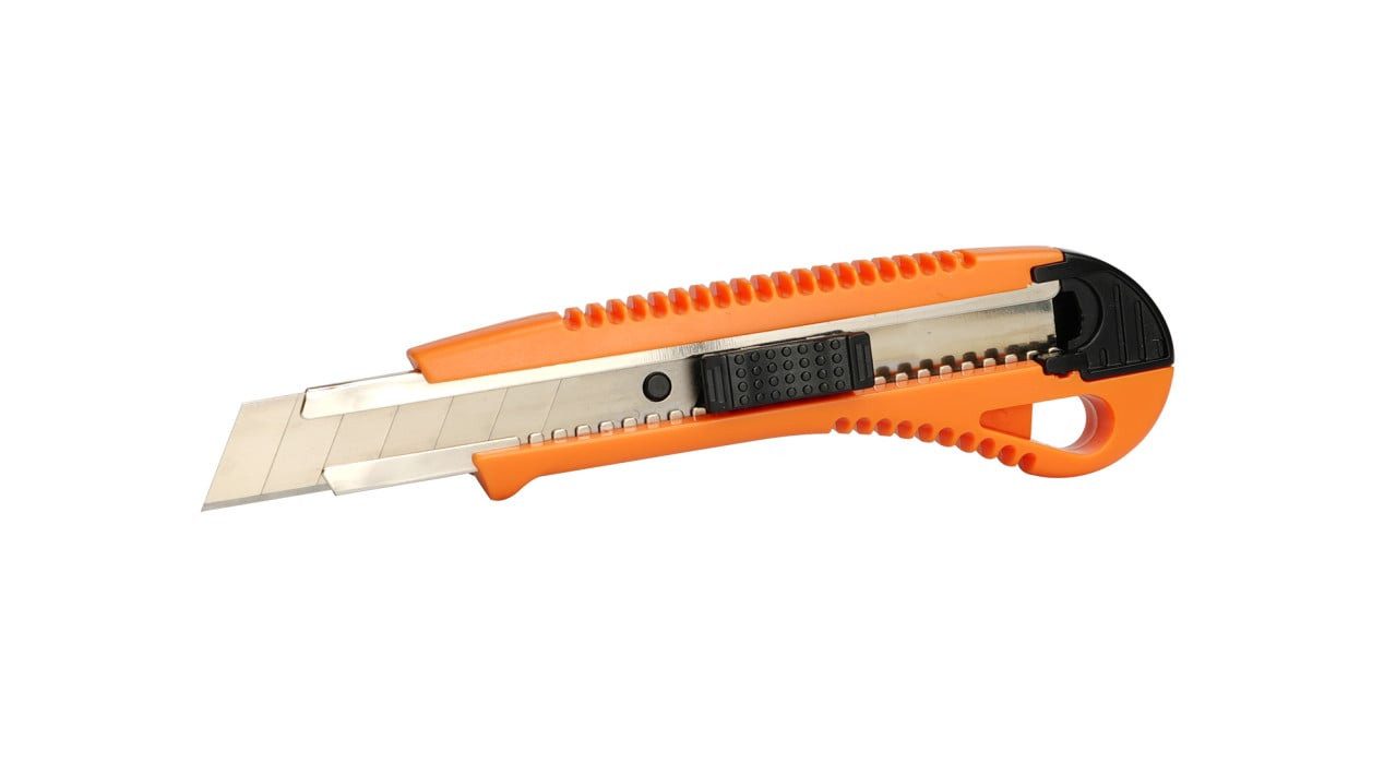 Produktdetails: 18 mm Abbrechklinge | Gehäuse aus ABS-Material mit rutschfester Struktur | Beschichtete Metallscheide | Automatischer Verriegelungsschieber | Inkl. 1 x SK5-Klinge L 100 × B 18 × H 0,5 mm | Mit Logo auf der Rückseite | Auto-Lock für sicheres und komfortables Arbeiten | SK5-Stahlklinge mit 7 abbrechbaren Segmenten | Saubere Schnitte in Papier, Karton, Teppich, Leder u. v. m. | Robustes ABS-Gehäuse mit Metallführungsschiene | Integrierter Klingenbrecher im Griffende |