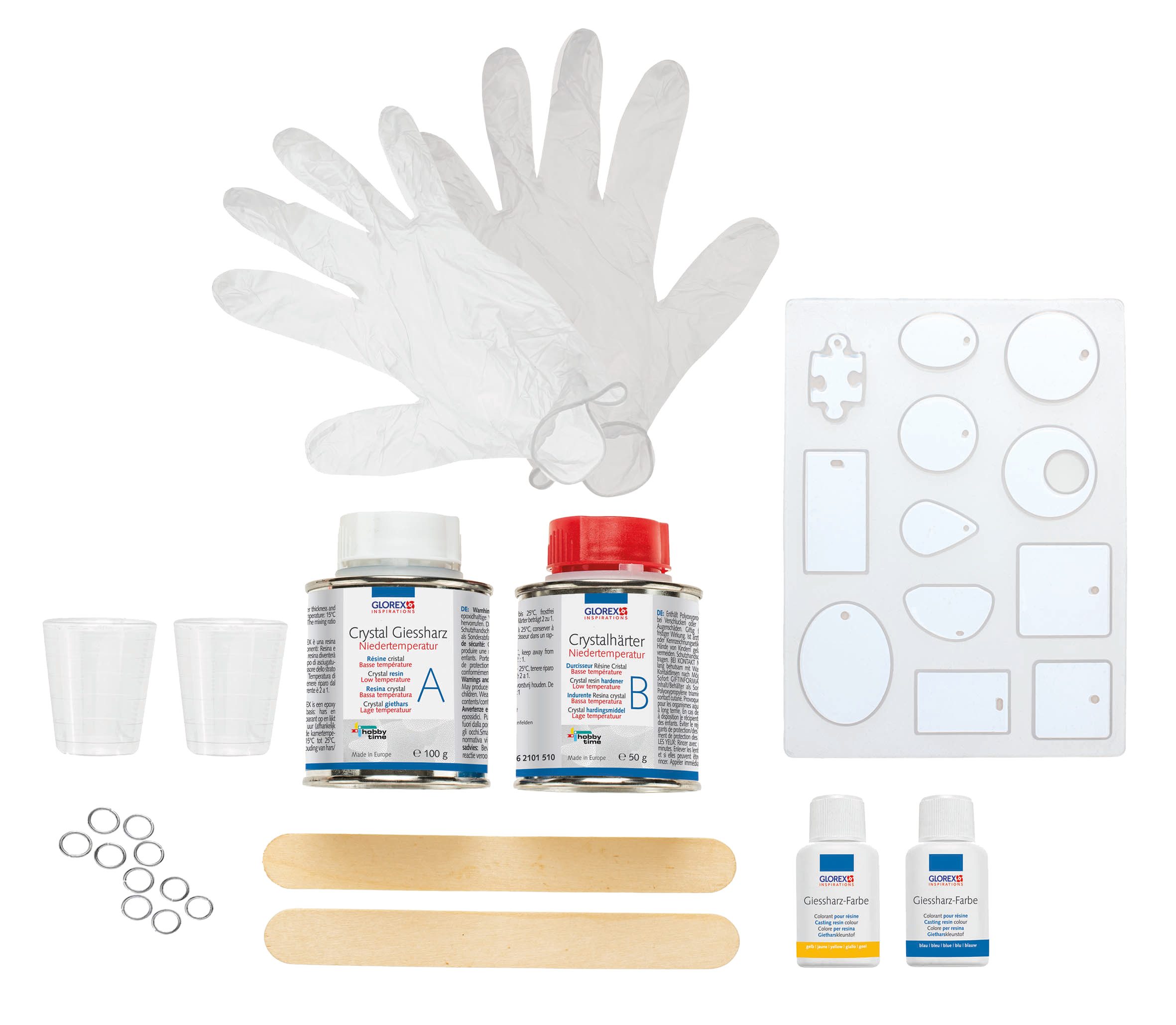 Gießharz Starter-Set 'Schmuck' für individuelle Schmuckstücke mit allen Materialien zum sofortigen Loslegen. Persönliche Anhänger lassen sich mithilfe von Gießharz, Formen, Farben und dem nötigen enthaltenen Zubehör ganz einfach herstellen. Es handelt sich um Crystal Gießharz Niedertemperatur, welches sich sehr gut zur Herstellung glasklarer Gießlinge eignet. Zudem kommt es zu geringer Temperaturentwicklung mit hoher Fließfähigkeit. Für individuelle Schmuckstücke, die mit eingemischter Lieblingsfarbe, Blattgold, zarten Blüten und mehr ein besonderer Hingucker werden. Je nach Dicke der Schicht beträgt die Trocknungszeit ca. 48 – 72 Stunden.