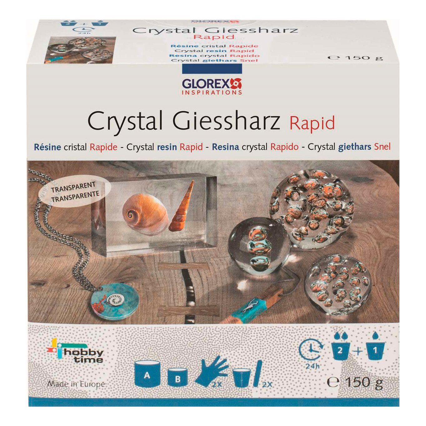 Crystal-Gießharz ist eine glasklare Gießmasse die sich leicht verarbeiten lässt. Die Gießmasse eignet sich besonders gut für die Schmuckherstellung, Einschlussarbeiten und Lasuren. Gleichzeitig können Glassteine, Perlen, filigrane Metallteile, Glitter und andere Ziergegenstände eingearbeitet werden. Das Gießharz wird im Verhältnis 2:1 (2Teile Harz 1Teil Härter angemischt) und härtet, abhängig von der Schichtstärke, in ca. 24 Stunden aus. Bitte die Hersteller Packungsanleitung beachten!