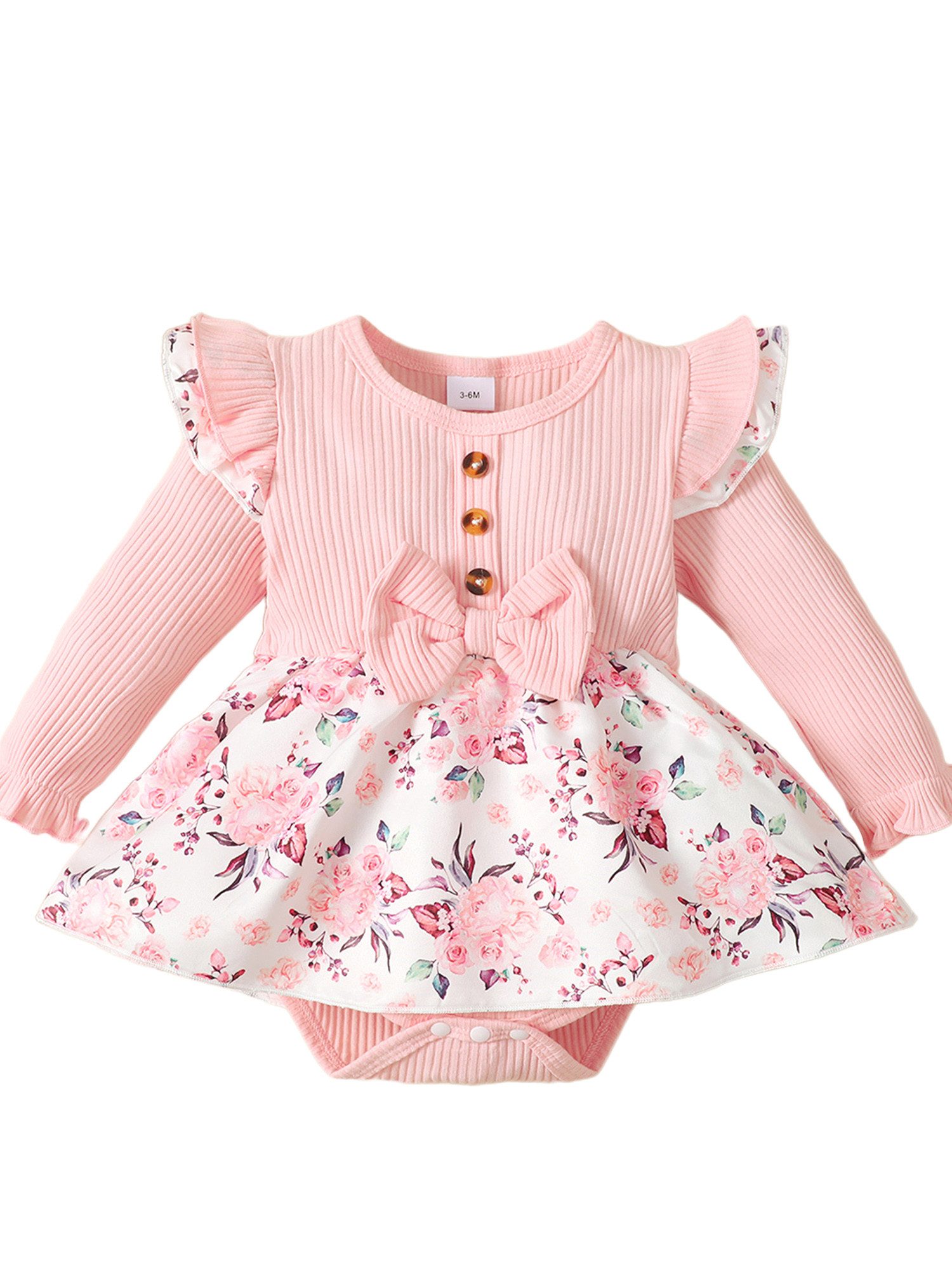 Süßes Design: Baby-Overall für Mädchen mit langen Ärmeln, Rundhalsausschnitt, Stirnband, gerüschten fliegenden Ärmeln, A-Linien-Rock mit zartem Blumendruck, dekorativer Schleife und einreihigen Knöpfen vorne, Patchwork-Design, das Ihr Baby süßer, gesünder und schöner macht energisch.