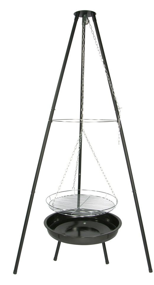 Dieser sehr schöne und doch schlicht gehaltene Schwenkgrill besticht durch seine einfache Bauart, kombiniert mit einem edlen Design. Der Grill verfügt über eine Feuerschale mit einem Durchmesser von 55 cm, die auf drei Beinen steht. Darüber hängt der Grillrost, der stufenlos in der Höhe verstellt werden kann und einen Durchmesser von 50 cm hat. Die drei Standbeine des Grills sind aus rundem Stahlrohr mit einem Durchmesser von ca. 25 mm gefertigt. Der Grill hat eine Gesamthöhe von 180 cm.