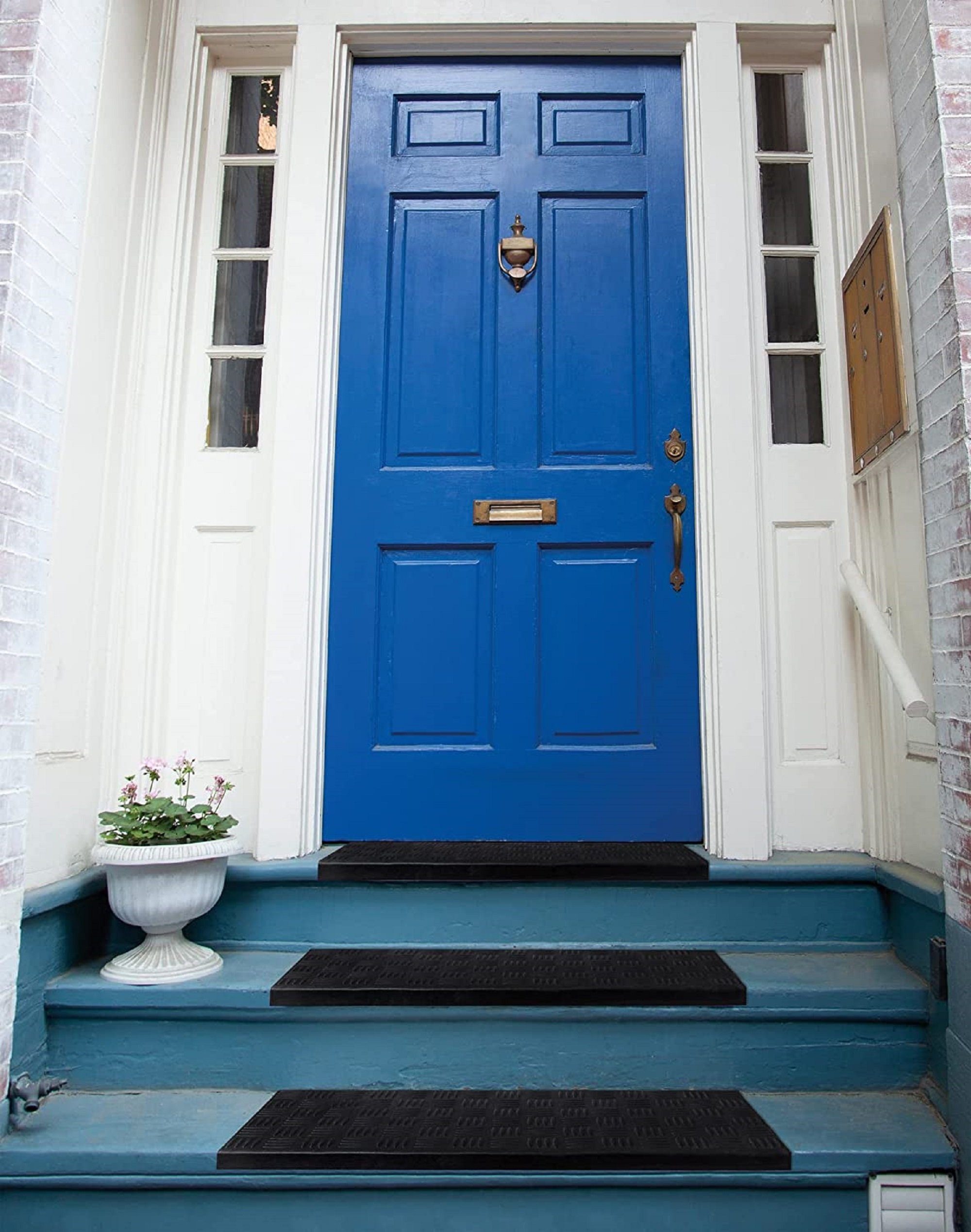 Stufenmatten - Stairmat - Serie • Robuste Stufenmatten im Stahl-Design: Diese Stufenmatten sind ein echter Hingucker. Gefertigt aus 100 % recyceltem PVC sind sie Witterungsbeständig und dadurch auch im Außenbereich einsetzbar und schützt dabei, unter anderem durch die Kante vorne, Ihre Stufen. • Rutschfest: Diese Matte bleibt an ihrem Platz, durch die Herstellung aus PVC und die Stoßkante vorne. Nichts wellt sich, so wird die Stolpergefahr gemindert. • Leicht zu reinigen: Всеs wird mal schmutzig und muss gereinigt werden, so auch diese Stufenmatten. Die Reinigung ist hierbei ganz einfach: Abwaschen oder abduschen, trocknen lassen, fertig. Schon kann sie wieder zurück an ihren Platz. • Außergewöhnliches Design in 5 verschiedenen Farben: Diese Matte besticht, neben ihrem Stahl-Design und der Wetterfestigkeit, auch durch die Auswahl aus 5 verschiedenen Farben. So ist für jede Treppe und jede Stufe die passende Farbe dabei.
