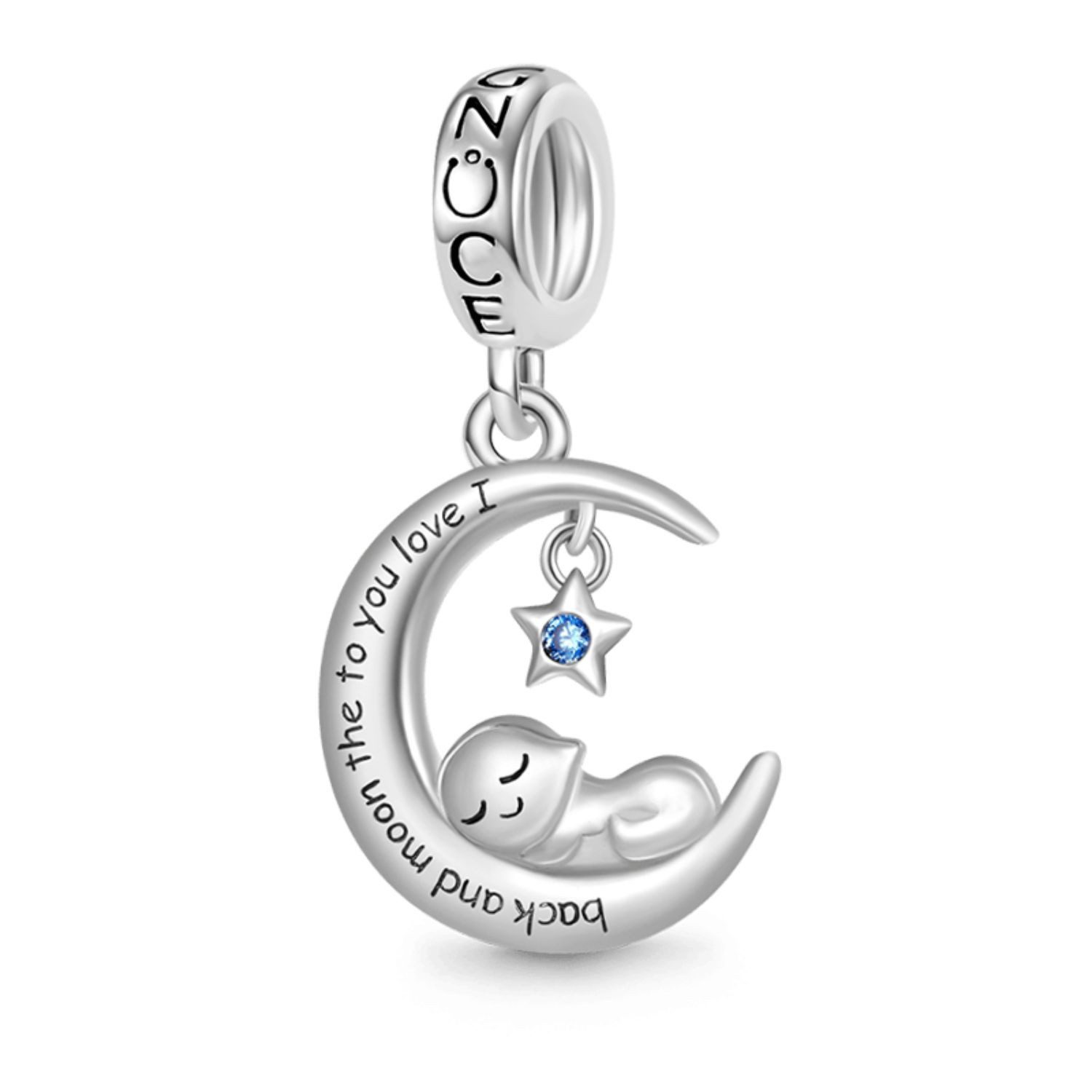 Feiern Sie einen Neuankömmling in der Familie mit dem Schlafendes Baby Love You Anhänger. Dieser handgefertigte Anhänger aus 925 Sterling Silber trägt einen süßen Stern und die Gravur "I love you to the moon and back" im Mond. Eine sinnvolle Ergänzung für das Armband einer stolzen Mutter, die auch ihrem Baby alles Gute wünscht.