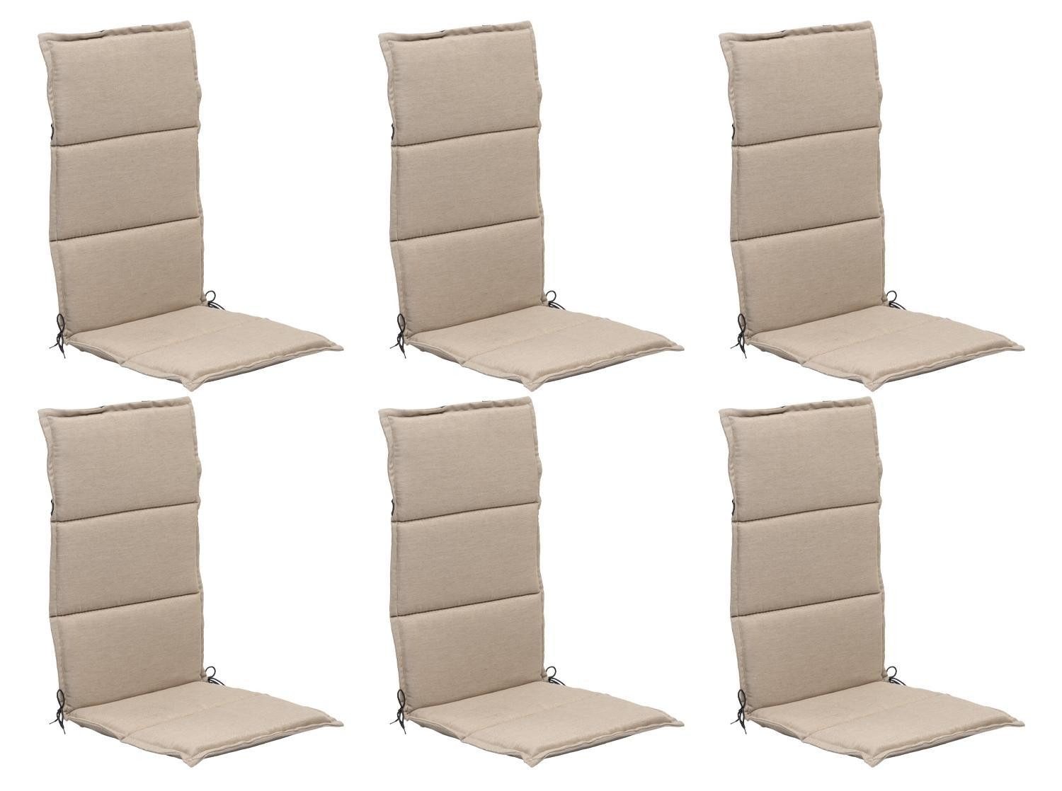 Lieferumfang | 6 Gartenstuhlauflagen für Hochlehnstühle mit verstellbarem Gurtband und seitlichen Bindekordeln |