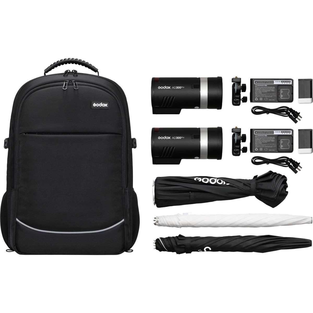 Das Kit enthält zwei bekannte Godox AD300 PRO-Blitze. Es verfügt über eine effiziente Batterie, eine drahtlose Fernbedienung und die Möglichkeit der Verwendung einer Vielzahl von Lichtmodifikatoren.