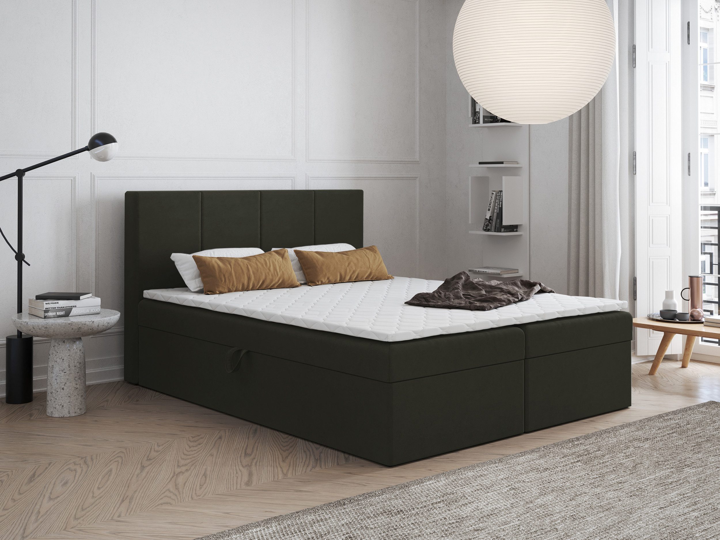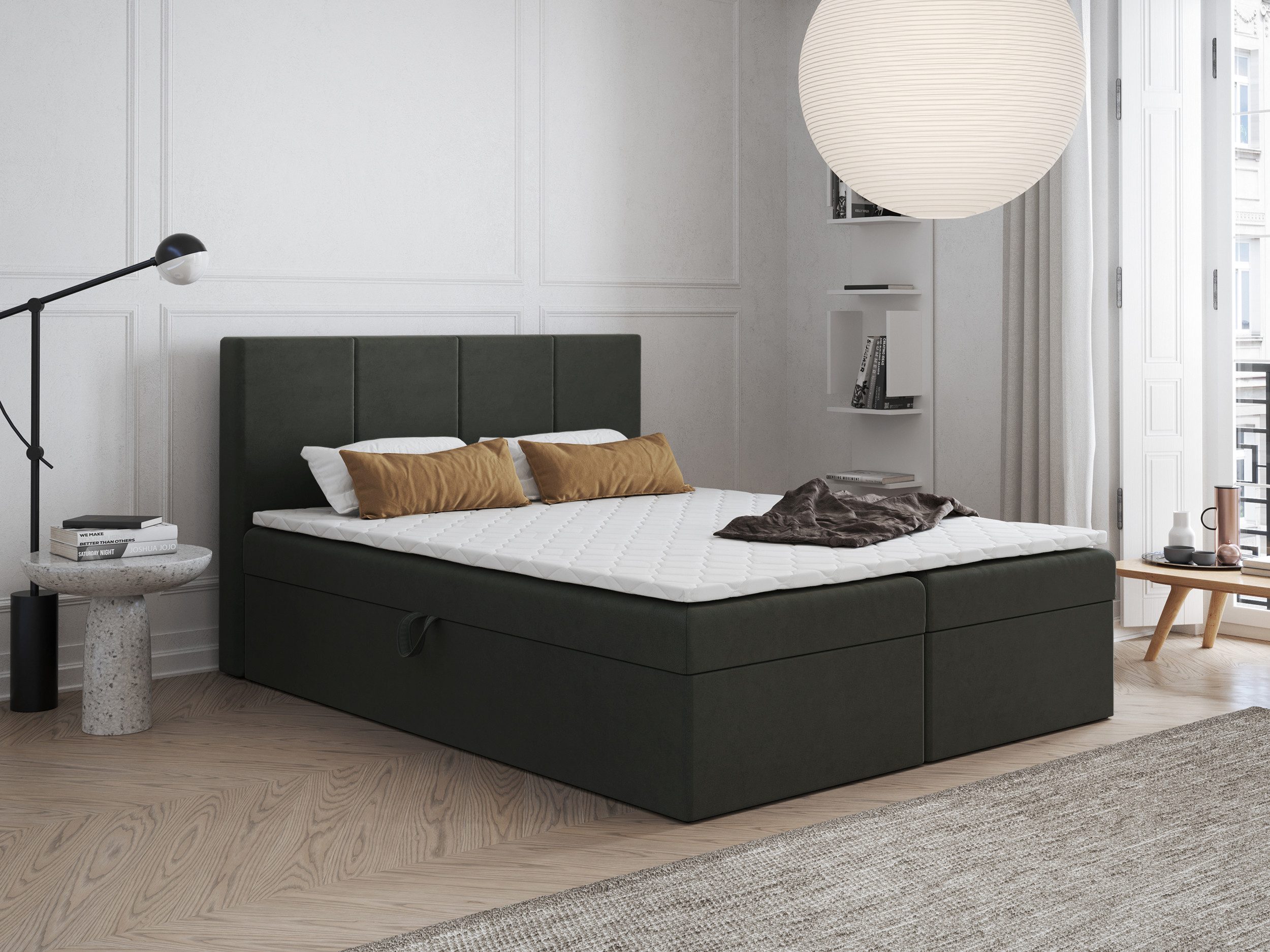 Bett mit Bettkasten, seitlich hochgestellt.