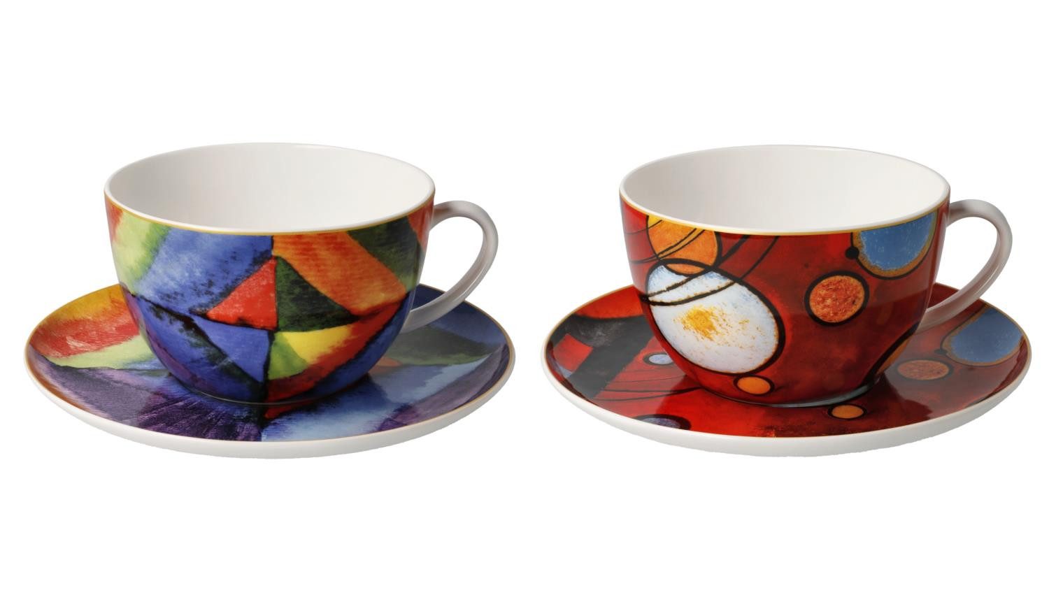 Lieferumfang: 2 Wassily Kandinsky Jumbotassen / Milchkaffeetassen mit Untertasse Schweres Rot + Farbstudie mit Goldrand je einzeln in Goebel Geschenkbox