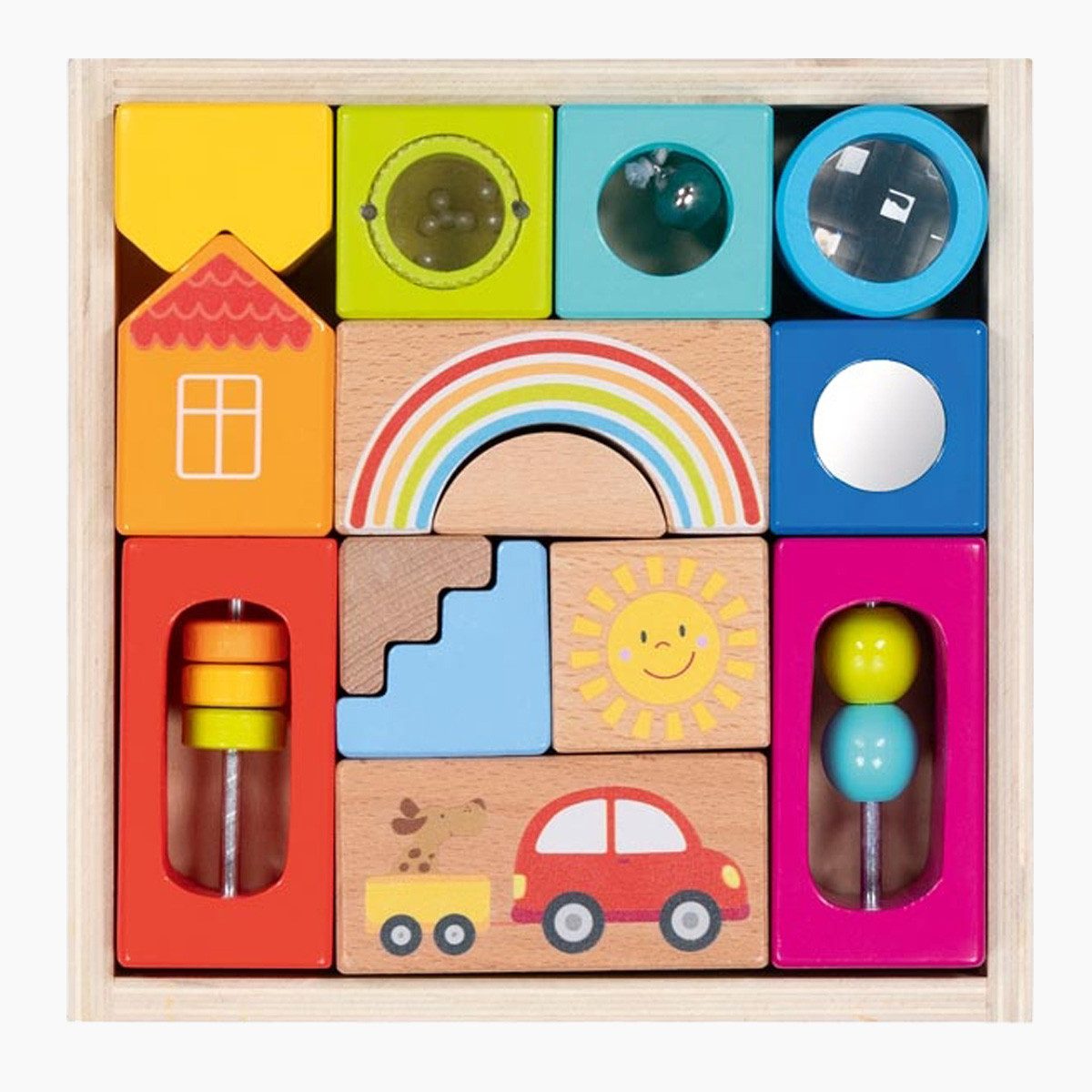 Das Set besteht aus 14 Teilen in verschiedenen Größen, Formen und Farben. Neben klassischen Bausteinen enthält es besondere Elemente wie ein eingebautes Kaleidoskop, transparente Kugelkammern und ein Bauteil mit Perlen. Dadurch wird jedes Spiel zur Entdeckungstour: Sehen, Hören und Fühlen werden gleichermaßen angeregt – ein ganzheitlicher Spielansatz, der Kinder begeistert.