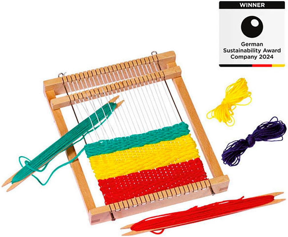 Lieferumfang | 2 Webschiffchen, Anleitung, Webrahmen, Wolle |