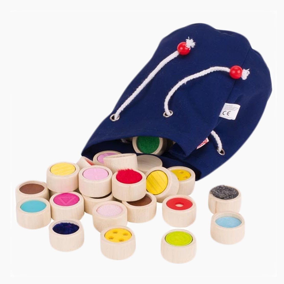 1. Paarweise ertasten: Zwei identische Oberflächen im Beutel finden – nur durch Fühlen.