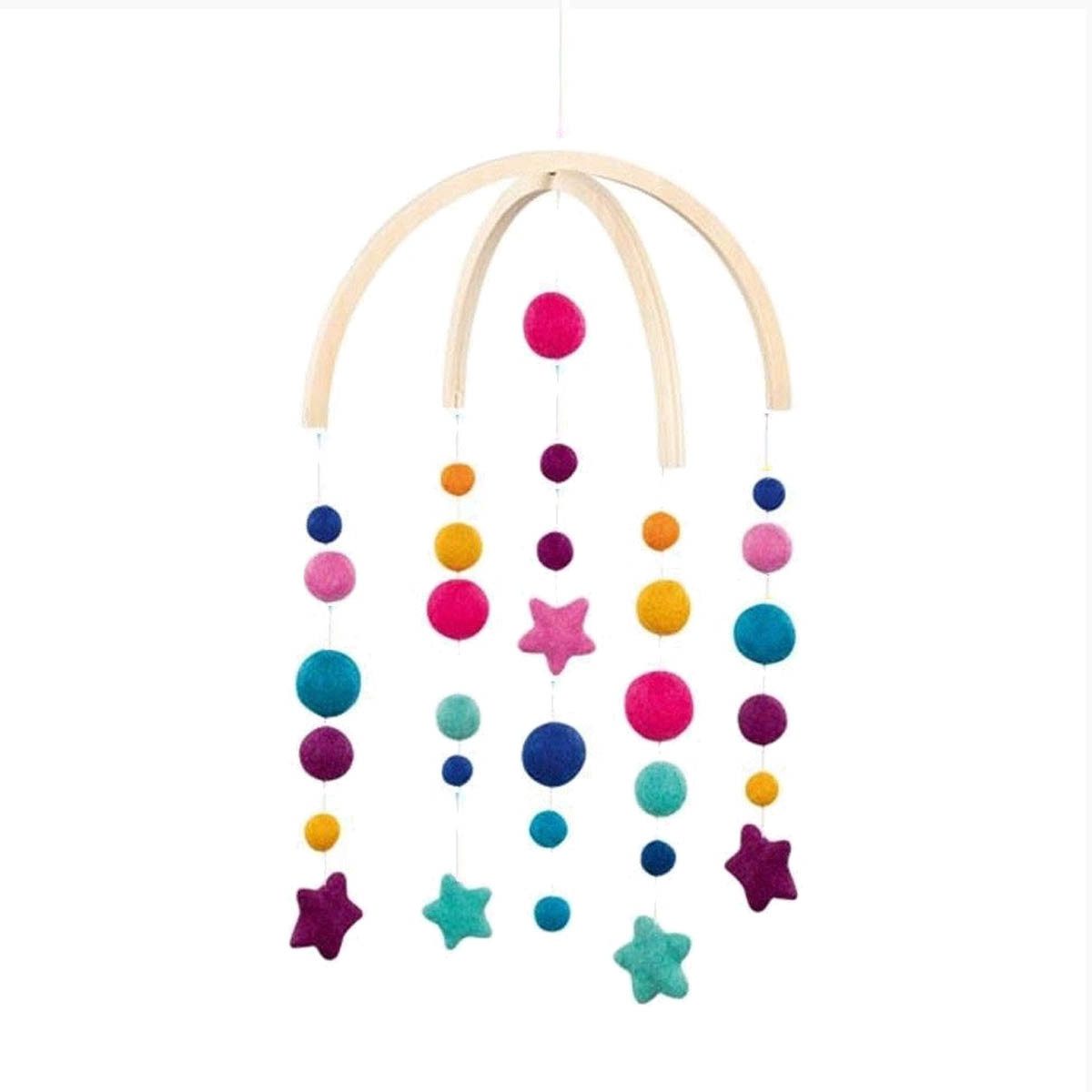 Die Elemente bestehen aus hochwertigem Wollfilz und sind an einem stabilen Holzgestänge befestigt. In leichten Luftzügen drehen sich die sternförmigen Figuren langsam im Kreis und regen dabei spielerisch die visuelle Wahrnehmung der Kleinen an. Besonders in den ersten Monaten, in denen Babys ihre Umgebung bewusst zu erkunden beginnen, bietet das Mobile eine wertvolle visuelle Stimulation.