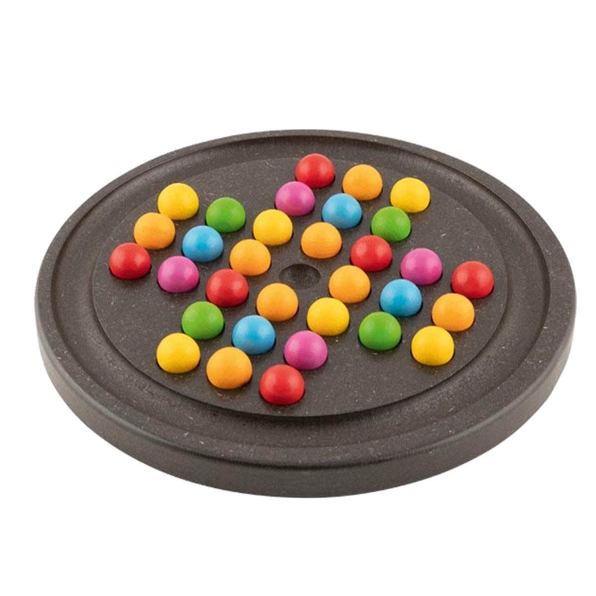Das Spielbrett besteht aus robustem MDF-Holz mit einer praktischen Ablagerinne für bereits entfernte Kugeln. Die 33 Kugeln sind farbig lasiert, was für ein ansprechendes Spielbild sorgt und zusätzlich die visuelle Wahrnehmung schult. Das klassische Rundformat ist auf Übersichtlichkeit und Funktionalität ausgelegt.