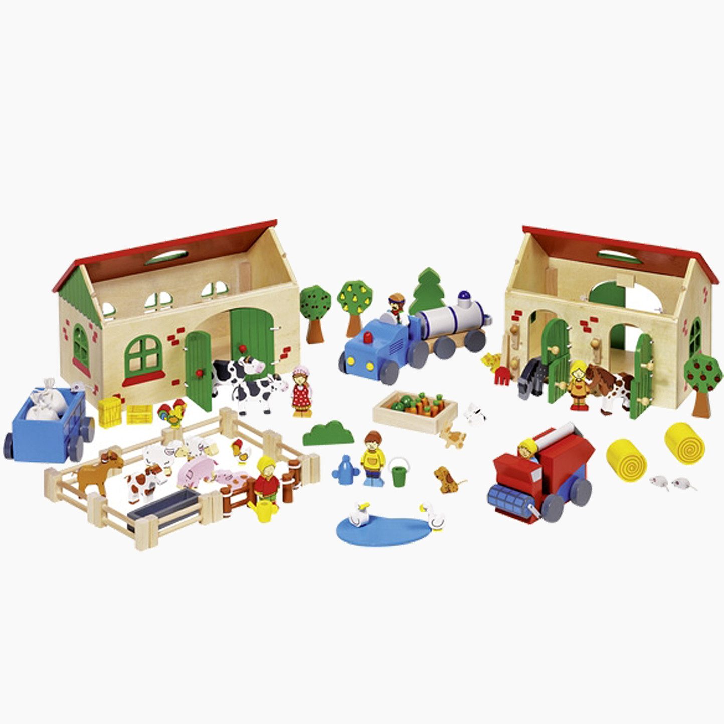 Zum Set gehören zwei Bauernhofgebäude mit klappbaren Dächern und funktionalen Türen und Fenstern. So können Kinder das Innenleben der Ställe erkunden, Tiere versorgen und neue Spielsituationen schaffen. Die liebevolle Gestaltung schafft eine naturnahe Umgebung, die zum langen Spielen einlädt.