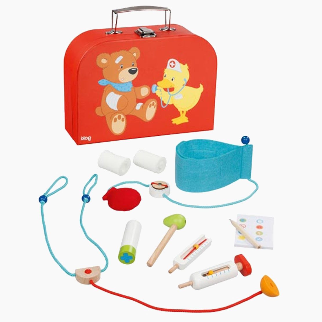 Das Set unterstützt Kinder dabei, Begriffe rund um den Arztbesuch kennenzulernen, spielerisch Fragen zu stellen und Handlungen nachzuahmen. Es schafft eine vertraute Grundlage, auf der Kinder das Erlebte reflektieren und nachspielen können. So wird das Arztspiel zu einem Erlebnis mit Tiefgang – voller Neugier, Kreativität und Lernerfolg.