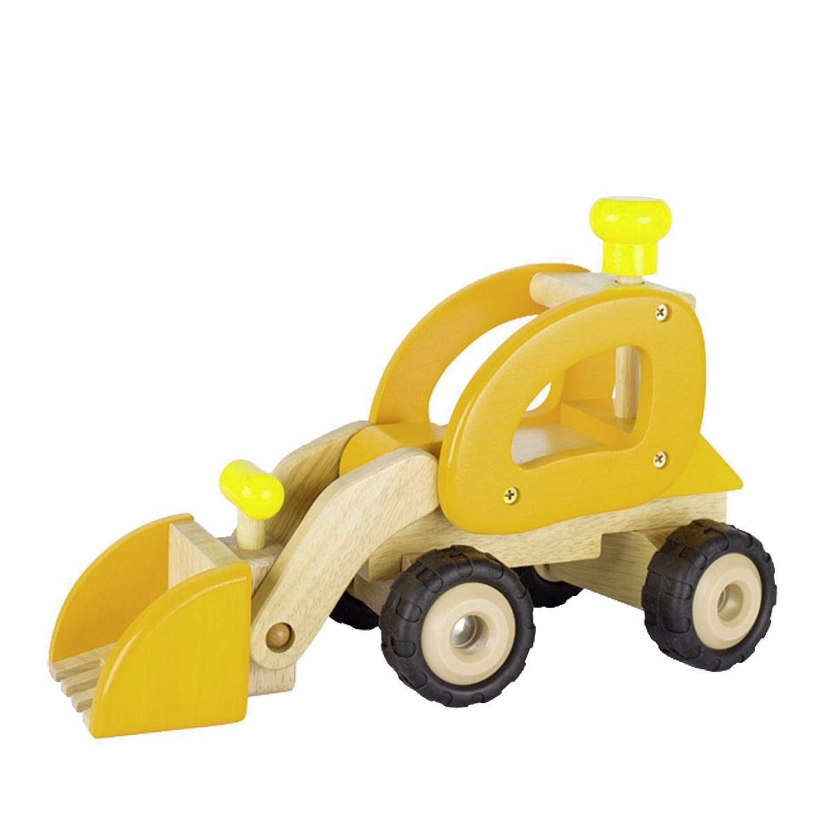 Gefertigt aus massivem Holz und mit einer naturbelassenen Oberfläche versehen, steht der Radlader für Qualität und Langlebigkeit. Die klaren Formen und abgerundeten Kanten machen ihn besonders griffig und sicher für Kinderhände. Der funktionale Schaufelarm an der Vorderseite lässt sich manuell bewegen – ideal zum Aufnehmen, Heben und Kippen von Spielmaterialien.