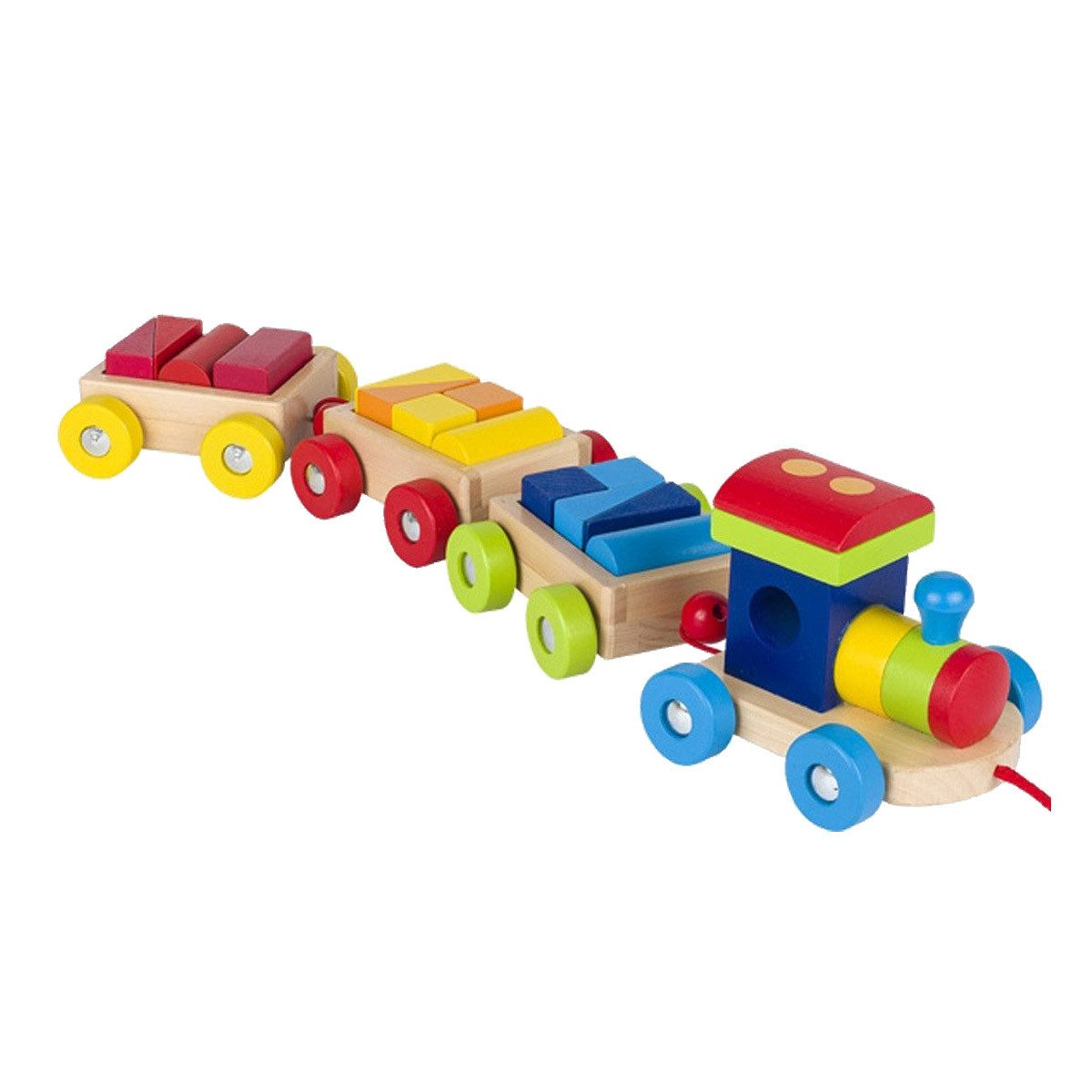 Durch das Verbinden der Schienen, das Stapeln von Bauklötzen und das Ziehen der Lok lernen Kinder auf spielerische Weise: