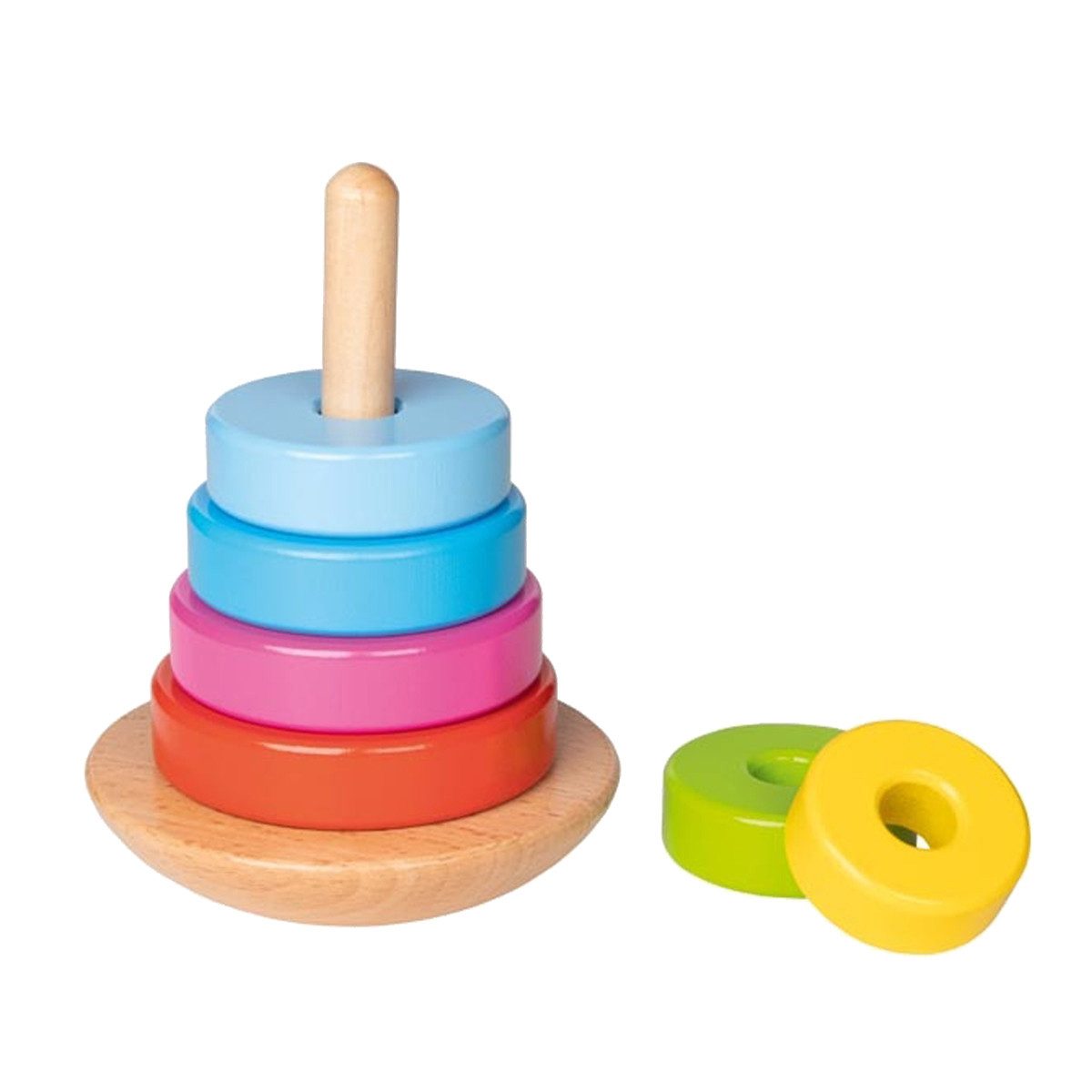 Die halbrunde Basis sorgt für zusätzlichen Reiz beim Spielen, denn der Turm schwankt sanft hin und her. Umso spannender wird es für Kinder, die Ringe in der richtigen Reihenfolge zu stapeln, ohne dass sie herunterfallen. So wird die Auge-Hand-Koordination gefördert und das räumliche Denken trainiert.