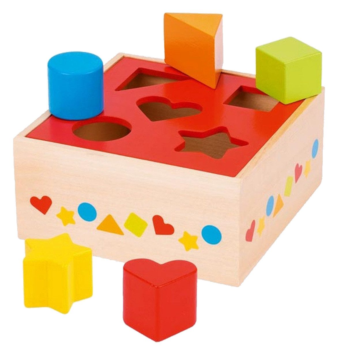 Die farbenfrohen Holzklötze in Herz-, Würfel- und Sternform passen nur in die jeweils passende Öffnung der Box. So lernen Kinder durch Versuch und Wiederholung, Formen zu erkennen und zuzuordnen. Gleichzeitig wird das räumliche Denken geschult, während die bunten Farben die visuelle Wahrnehmung stärken und erste Begriffe gefestigt werden können.