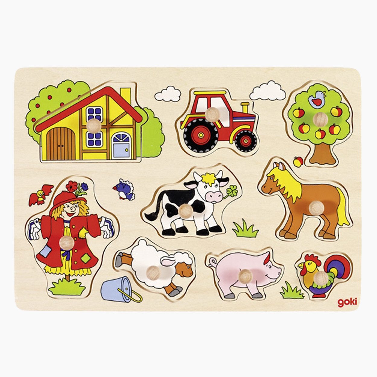 Mit dem Steckpuzzle Bauernhof 6 von goki tauchen die Kleinsten ab 1 Jahr in die faszinierende Welt des Bauernhofs ein! Die 9 farbenfrohen Holzteile mit kindgerechten Bauernhofmotiven lassen sich leicht greifen und in die entsprechenden Aussparungen einsetzen und sorgen dabei für jede Menge Spielspaß und Lernerfolge.