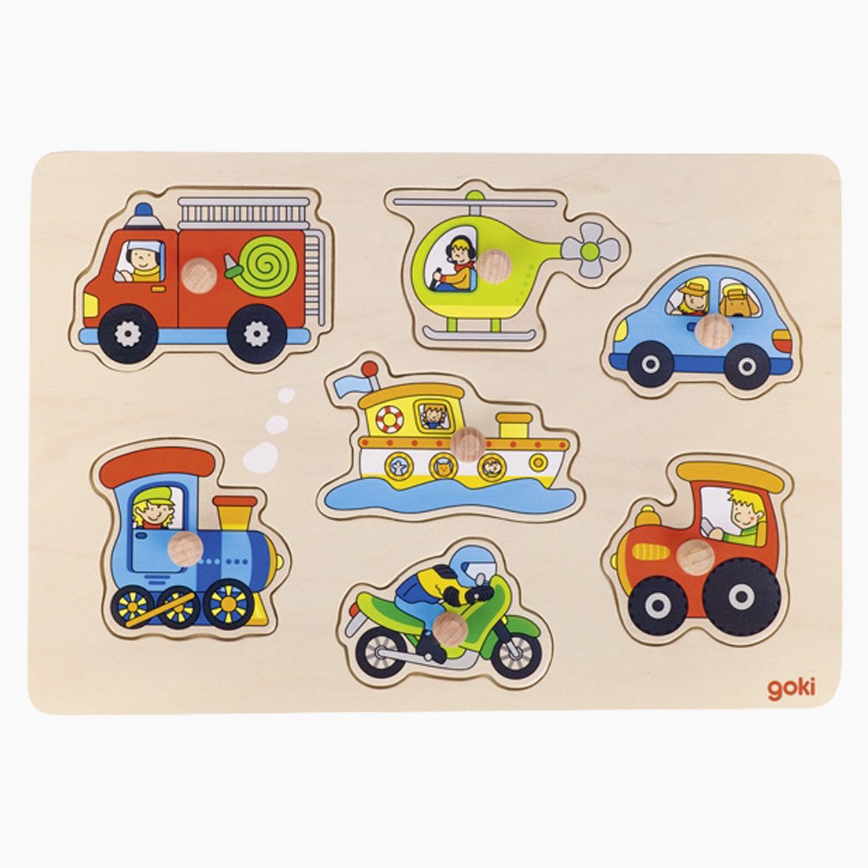Ein erstes Puzzleabenteuer mit Auto, Flugzeug & Co.: Das Steckpuzzle „Verkehrsmittel“ von goki lädt Kinder ab 1 Jahr ein zu einer spannenden Reise durch die Welt der Fahrzeuge. Sieben farbenfrohe Holzteile in Form von Auto, Bus, Flugzeug, Schiff und anderen beliebten Verkehrsmitteln regen zum Spielen, Greifen und Entdecken an – ideal für die ersten motorischen und kognitiven Lernerfahrungen.