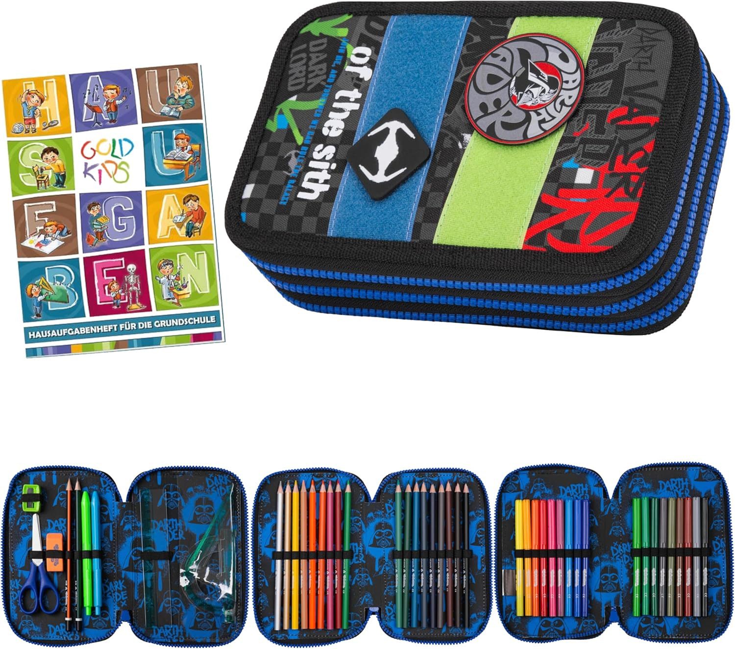 Die gefüllte Schüleretui ist faltbar, was die Organisation und den Zugang zu Schulmaterialien erleichtert. Drei separate Fächer ermöglichen eine effektive Anordnung von Schreibwaren wie Stiften, Bleistiften, Radiergummis, Linealen und anderen kleinen Zubehörteilen.