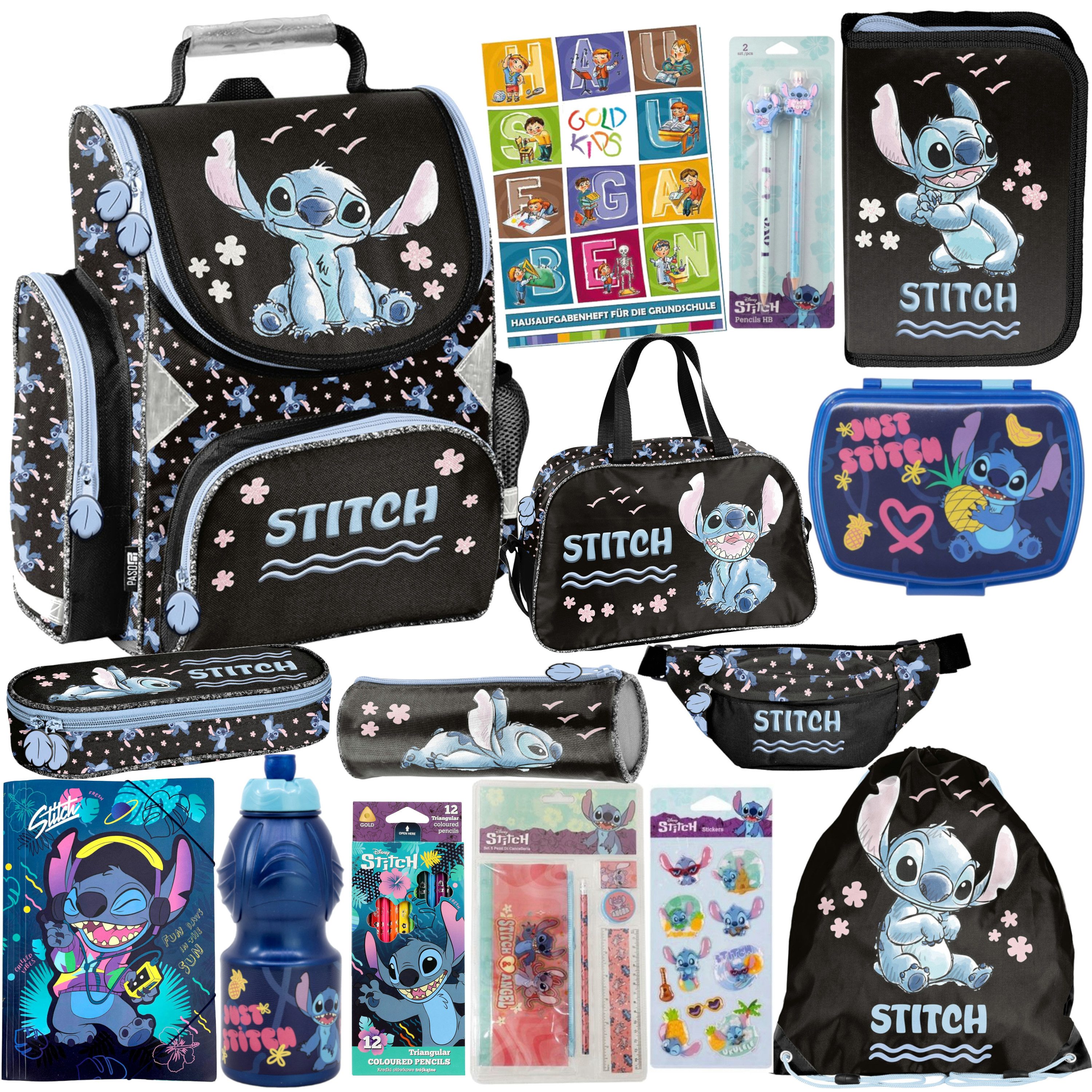 Schulranzen, einem Federmäppchen, einer Sammelmappe mit Gummiband, einer Lunchbox, einer Trinkflasche, einem Turnbeutel,Stiftetasche, Sporttasche, 12-teiliges buntstift-set, Stifteetui in tubenform, 2 bleistifte, Stitch aufkleber,bauchtasche,5-teiliges schulset, + kostenloser Hausaufgabenheft