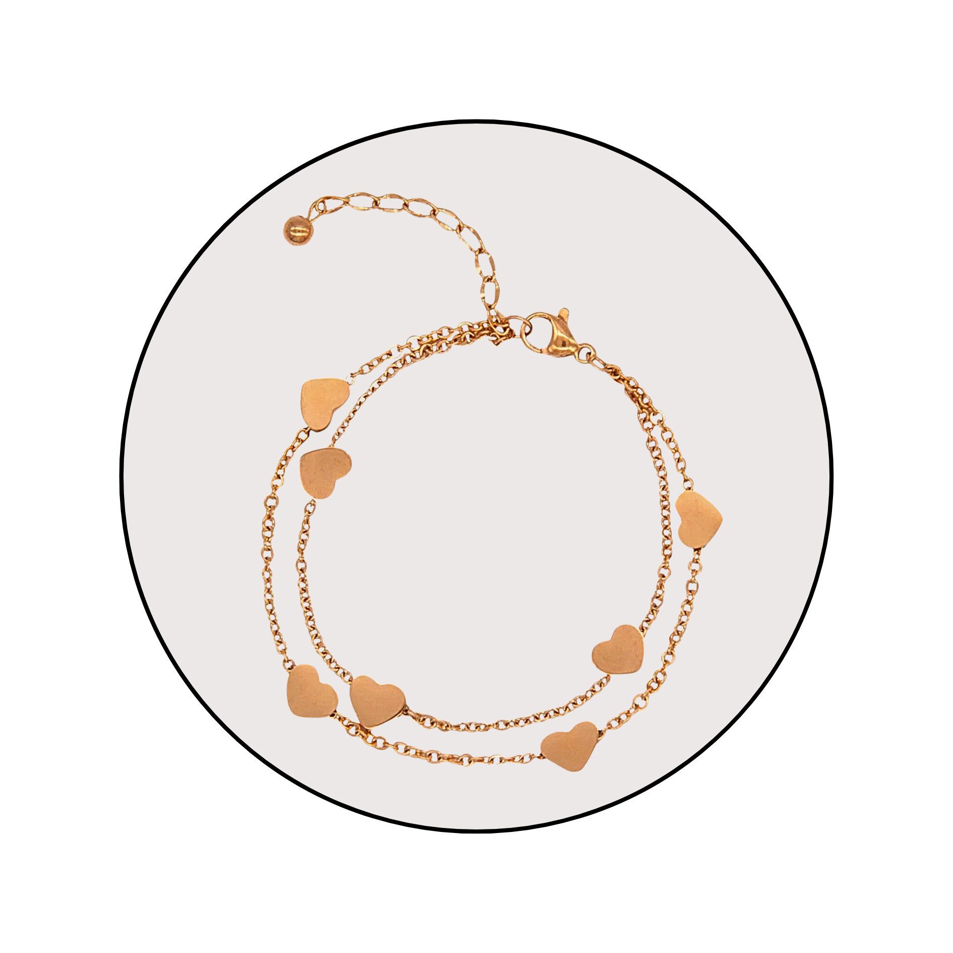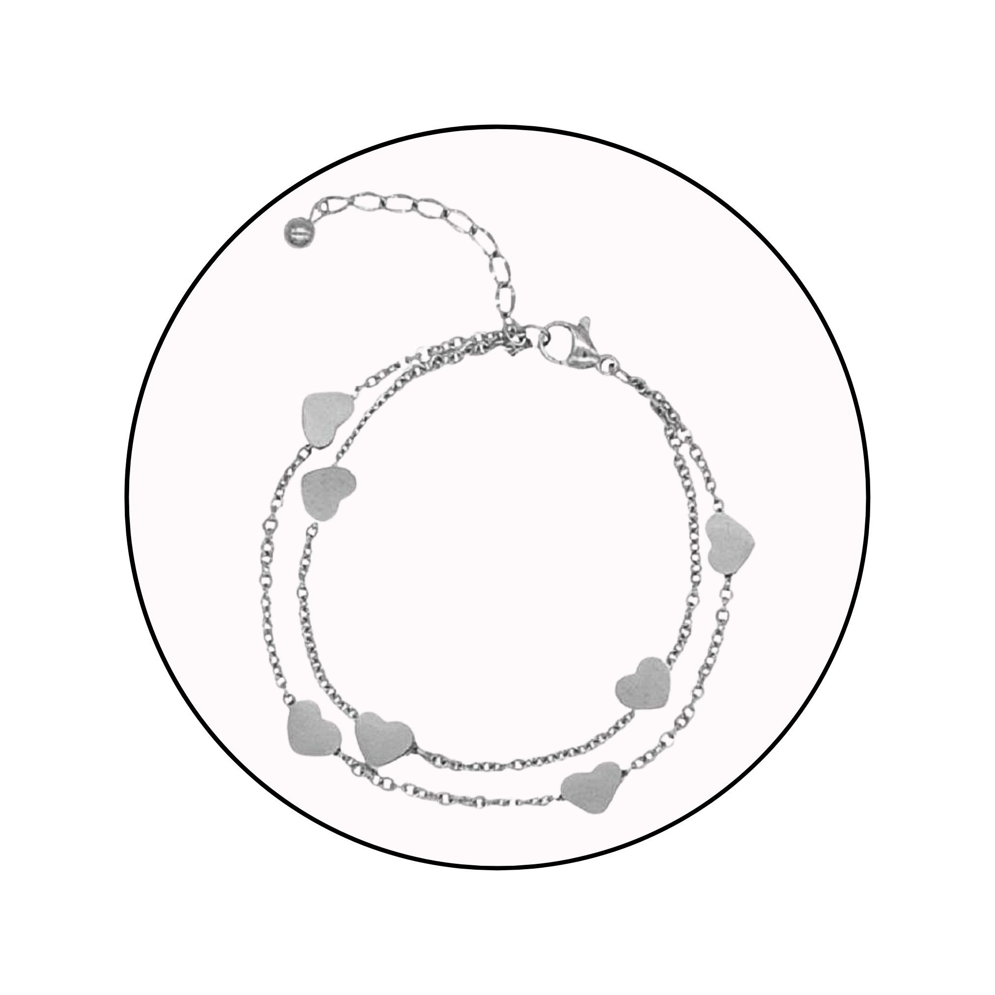 Dieses zarte Armband verleiht Ihrem Look eine feminine und romantische Ausstrahlung. Mit seinen zwei filigranen Ketten und den sanft glänzenden Herzanhängern setzt es stilvolle Akzente – perfekt für den Alltag oder besondere Anlässe.