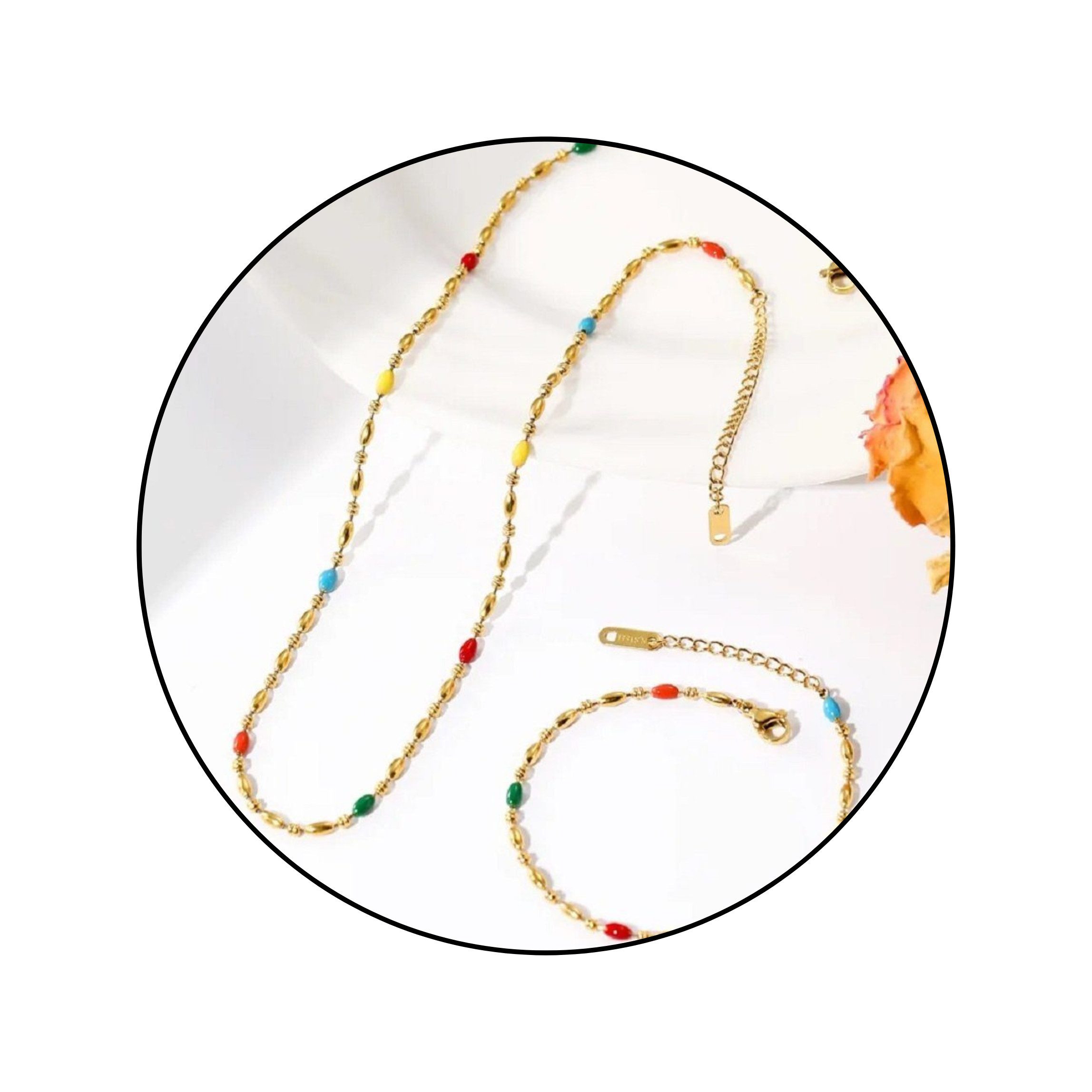 Bringen Sie Farbe und Eleganz in Ihren Look mit diesem stilvollen Schmuck-Set, bestehend aus einer Halskette und passendem Armband. Die Kombination aus hochwertigem, vergoldetem Edelstahl und den bunten Perlenelementen verleiht dem Set eine lebendige und verspielte Note. Perfekt für den Sommer, den Alltag oder als strahlendes Highlight zu besonderen Anlässen!