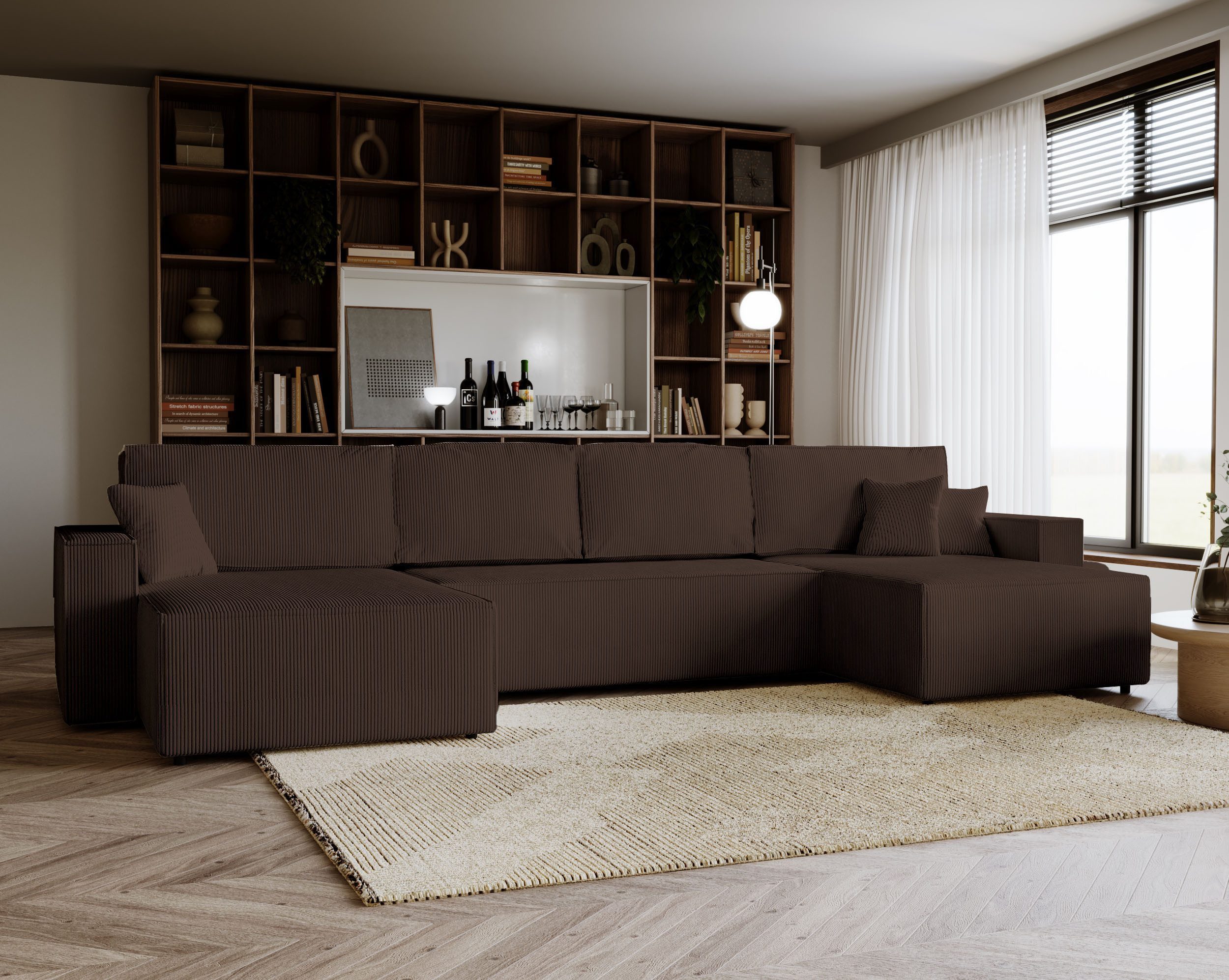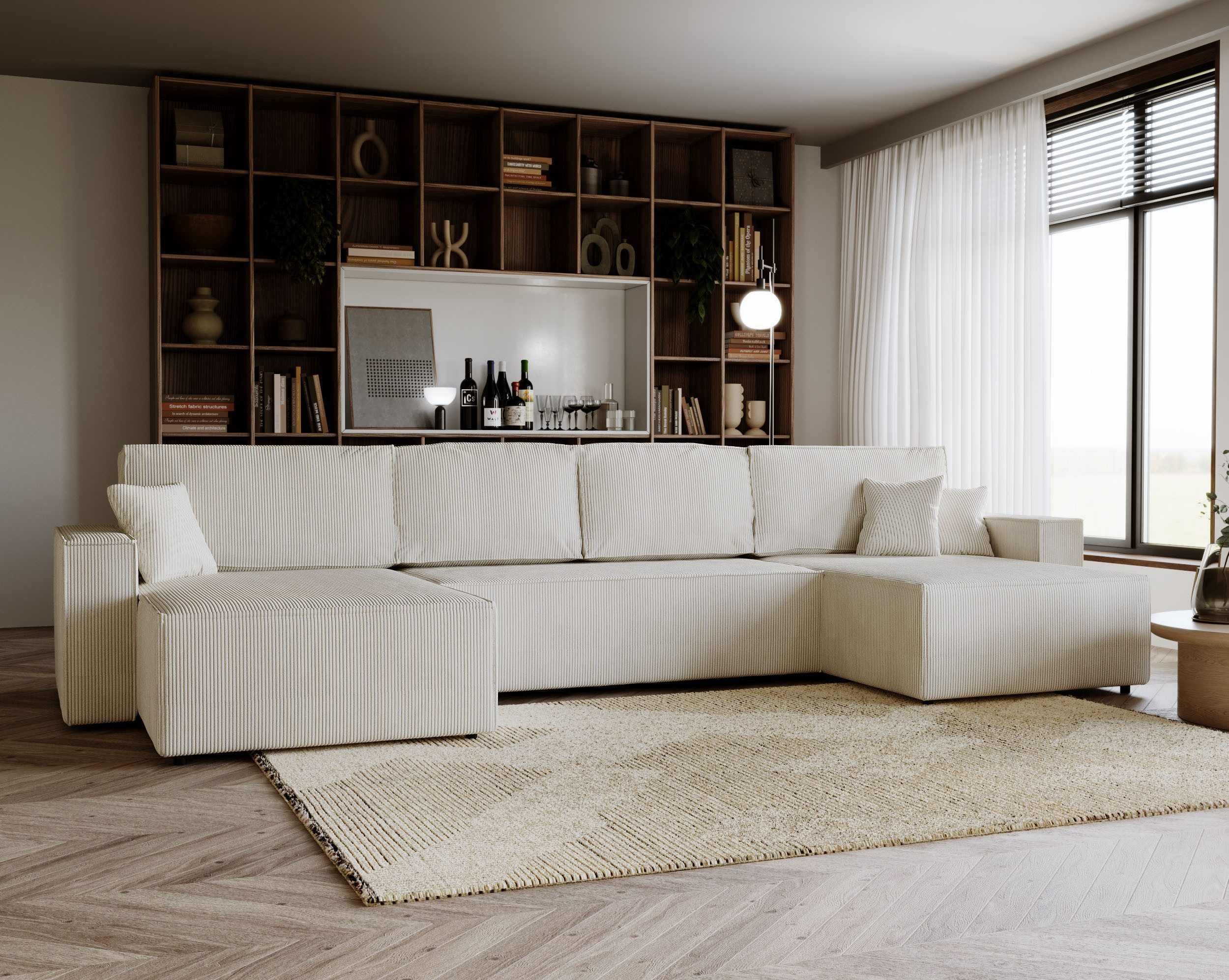 Das Amalia U-Sofa mit Schlaffunktion bietet die perfekte Kombination aus Design, Funktionalität und Flexibilität. Mit seiner universellen Stellvariante kann das Sofa sowohl links- als auch rechtsseitig aufgebaut werden – ideal für jede Wohnraumsituation. Dieses moderne Ecksofa in U-Form bringt nicht nur Stil, sondern auch maximale Funktion in Ihr Zuhause.
