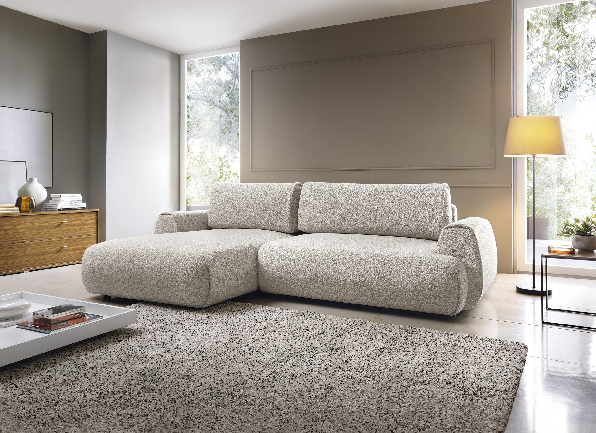 Der exklusive PUENTE-Stoff – mit 5 % Baumwollanteil – verleiht dem Ecksofa nicht nur eine edle Haptik, sondern überzeugt auch durch hohe Abriebfestigkeit und Pflegeleichtigkeit. Die fein strukturierte Oberfläche mit dezenter Körnung sorgt für Tiefe und Eleganz im Raum. Dank hoher Materialqualität bleibt die Couch auch bei täglicher Nutzung formschön und belastbar.