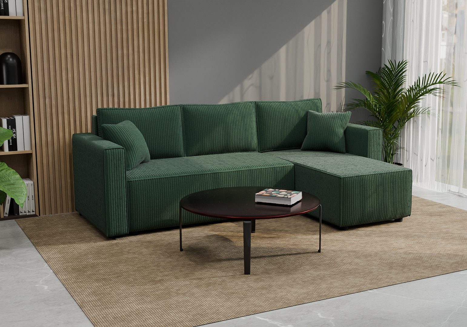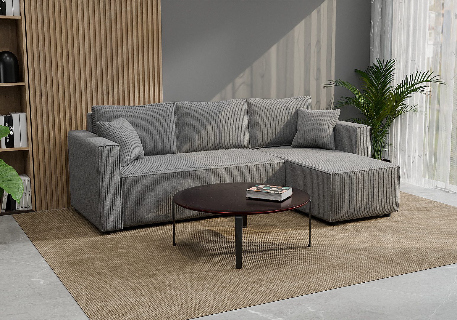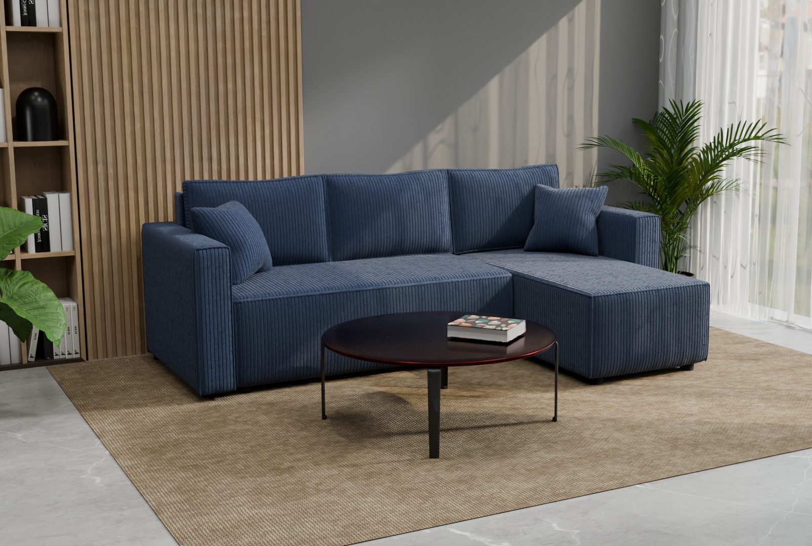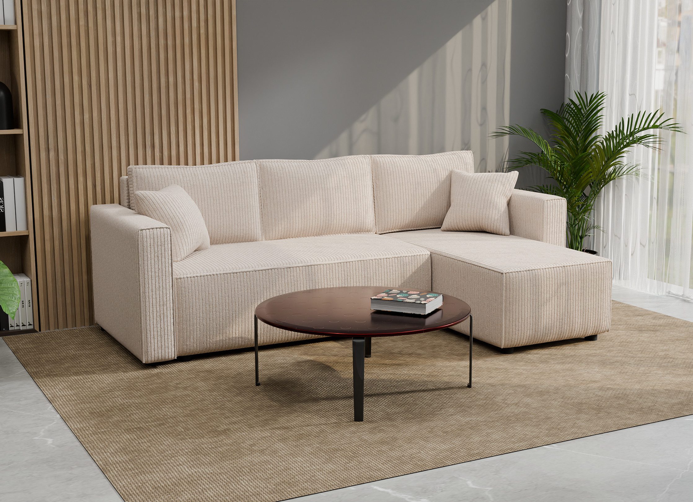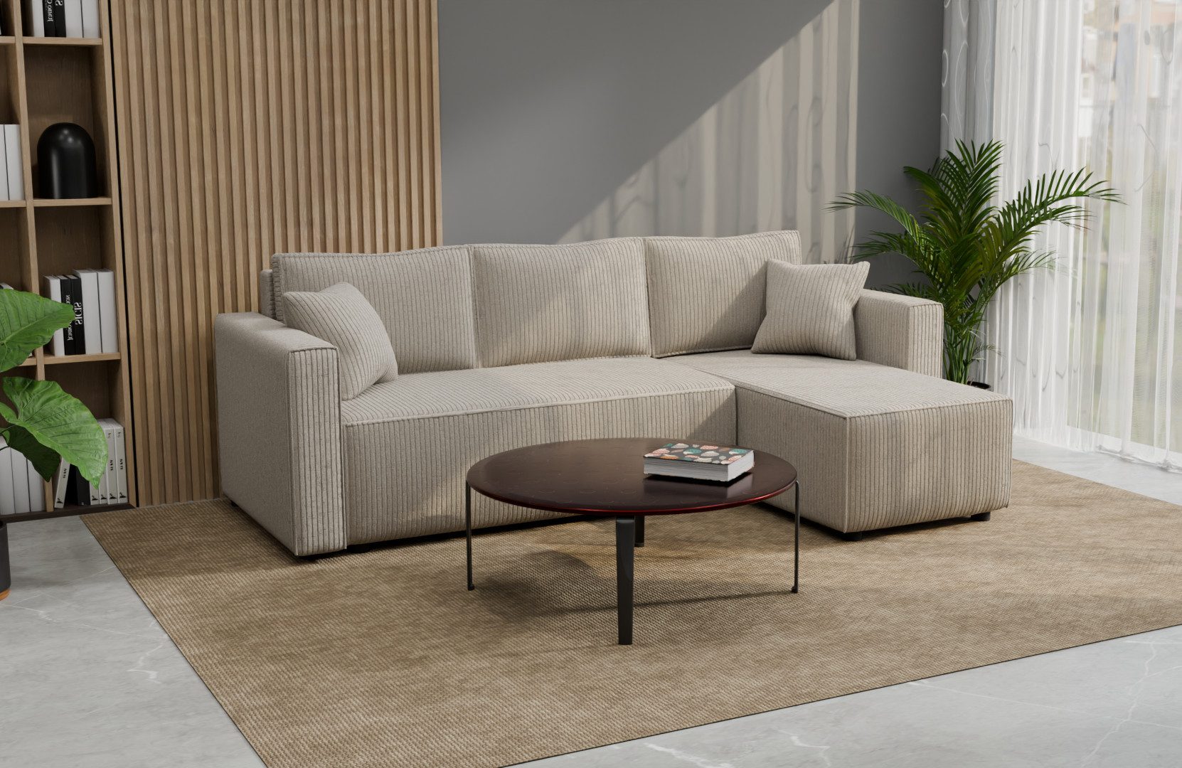 Das Ecksofa überzeugt durch seine klare, geometrische Form und die trendige Cord-Oberfläche. Dank der kompakten Maße passt es auch in kleinere Wohnzimmer, ohne auf Komfort zu verzichten. Erhältlich in verschiedenen Farben, lässt sich das Sofa perfekt an den individuellen Wohnstil anpassen.
