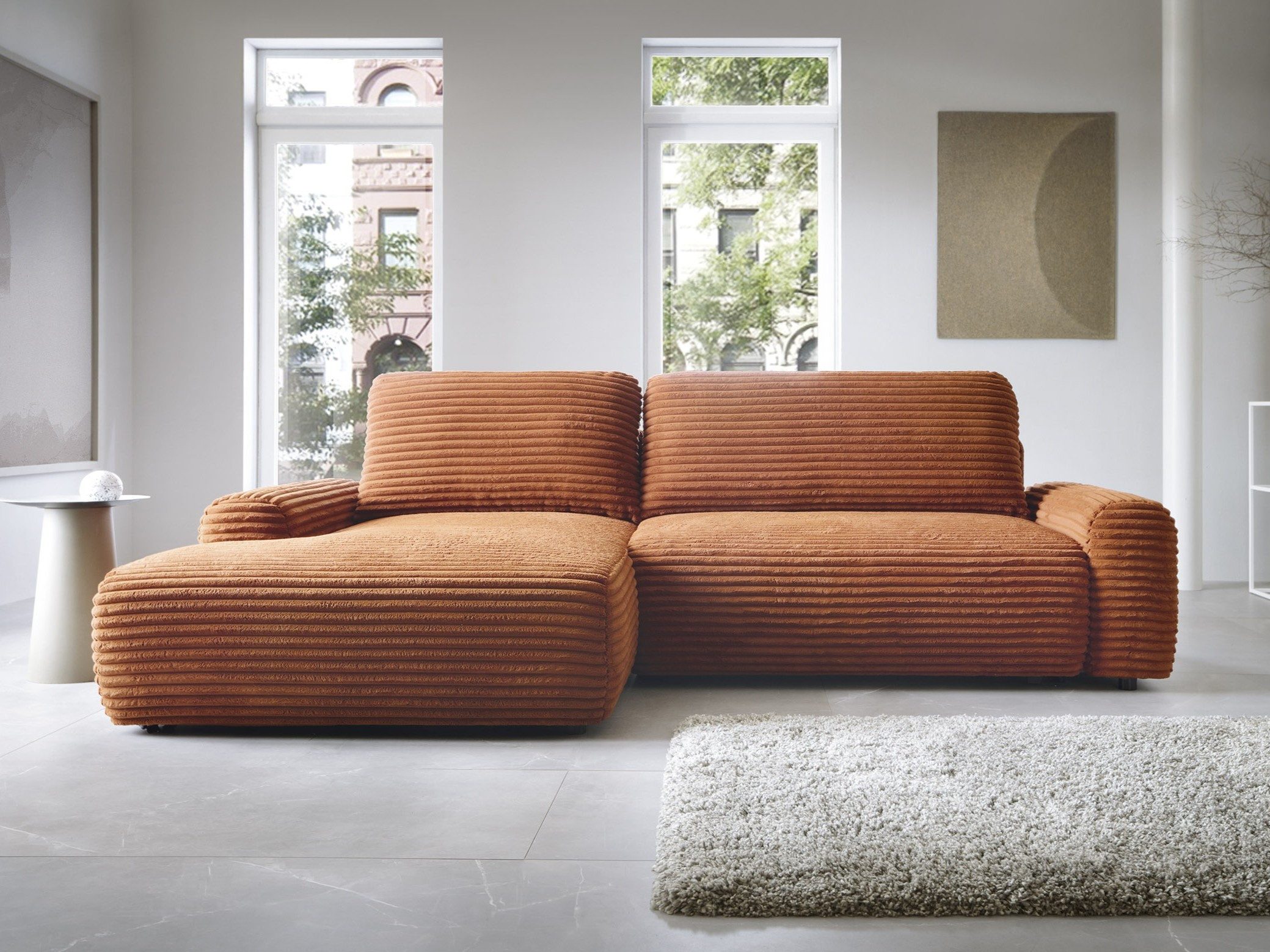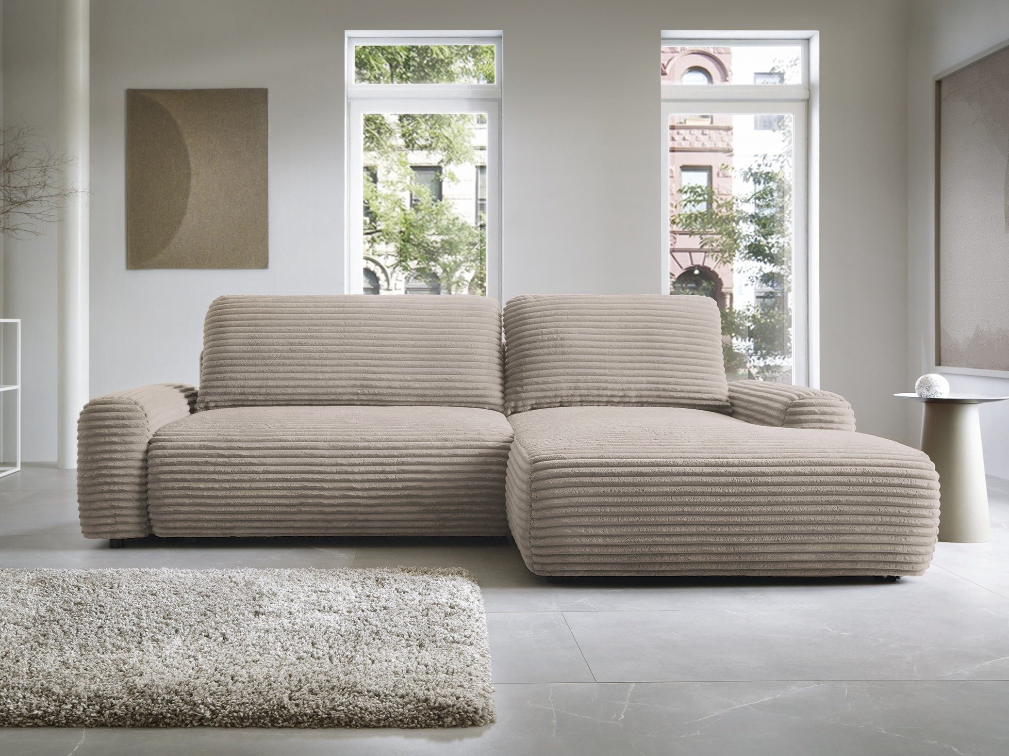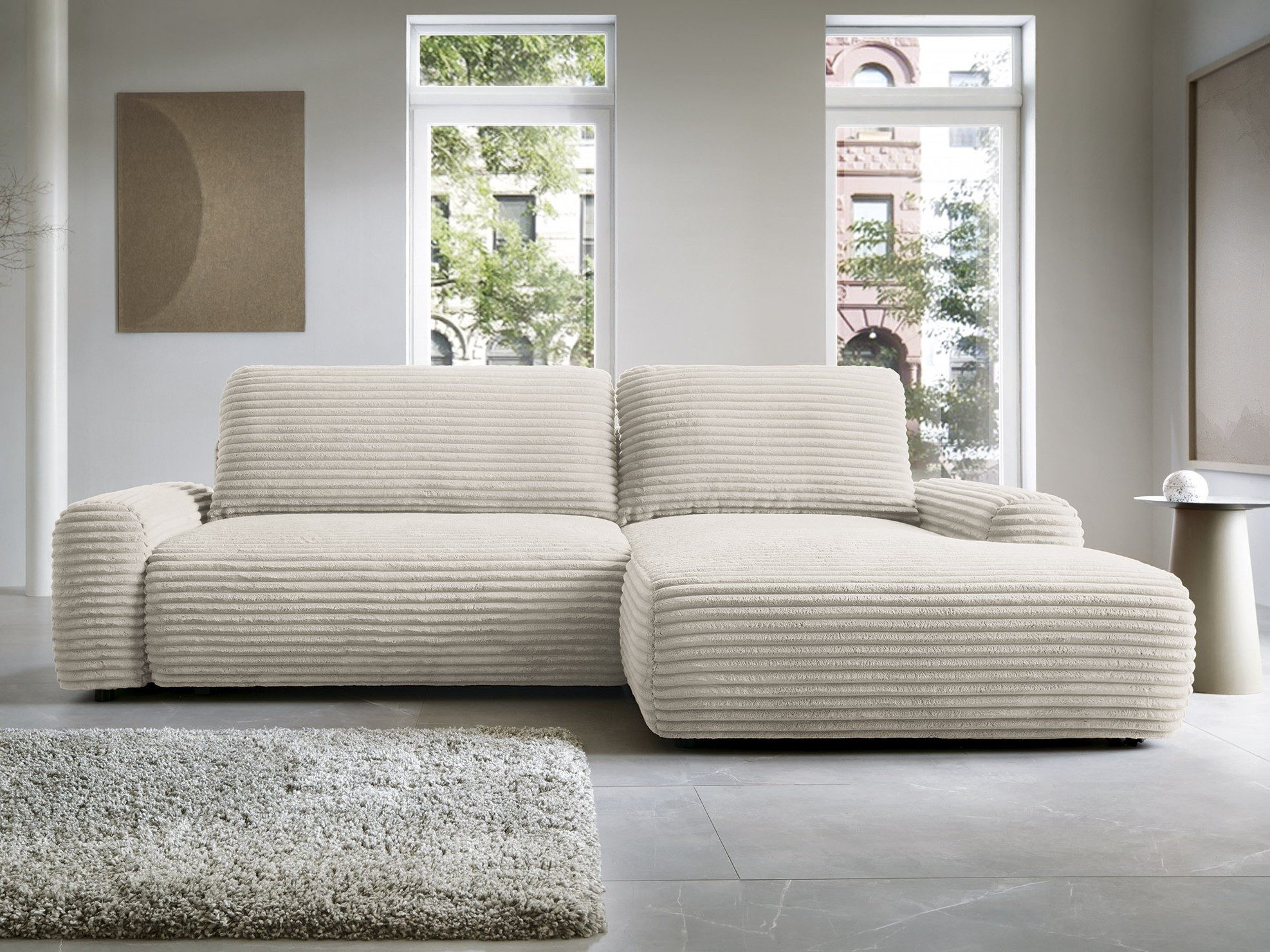 Die Eckcouch MOUNIR in L-Form überzeugt mit einer gelungenen Kombination aus modernem Corddesign, funktionalen Highlights und außergewöhnlichem Sitzkomfort. Ob als stilvoller Mittelpunkt im Wohnzimmer oder als gemütliches Schlafsofa für Gäste – dieses Möbelstück ist in jeder Hinsicht ein Gewinn.