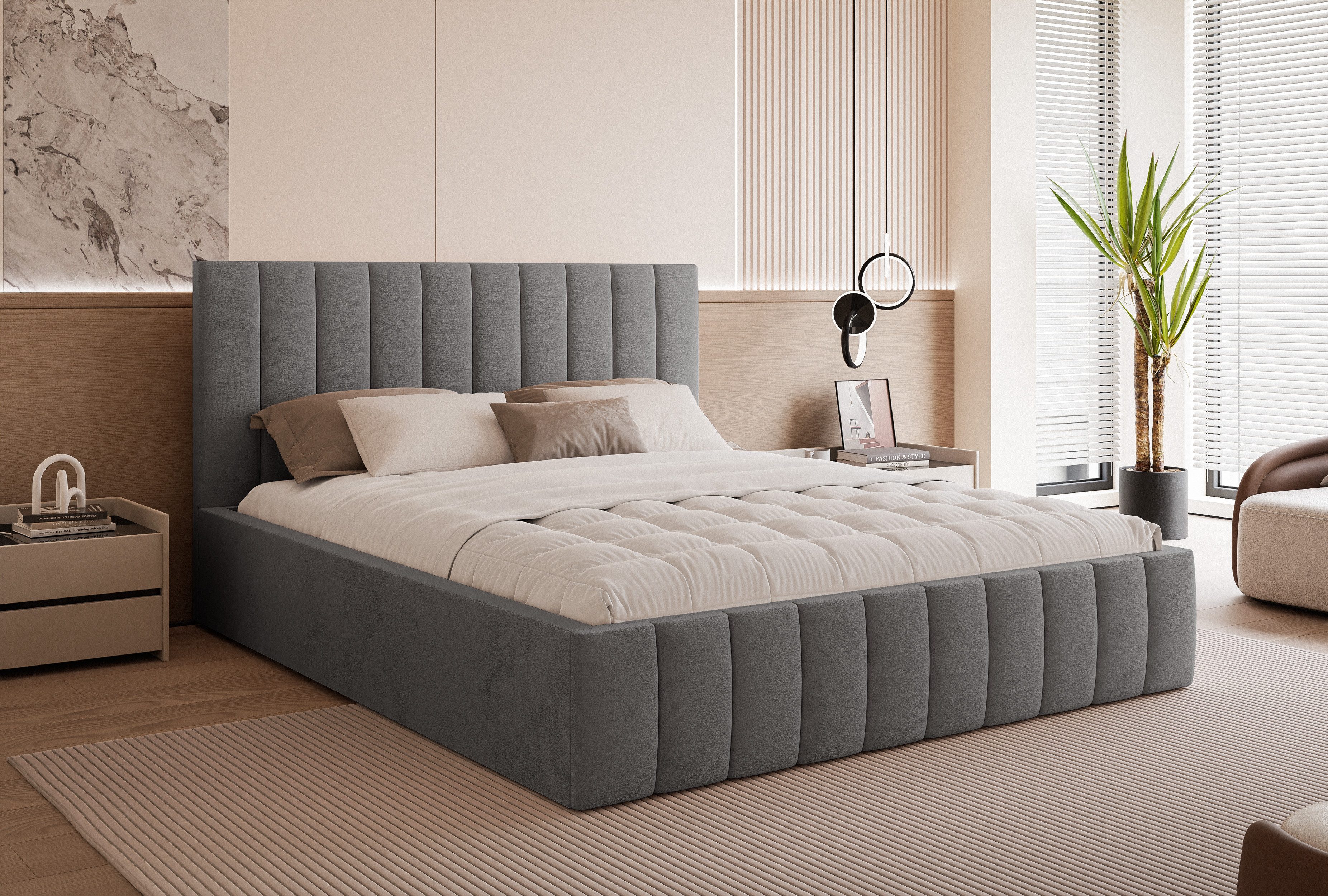 Das Kopfteil ist in zwei verschiedenen Höhen (90 cm oder 110 cm) erhältlich und mit einer 3 cm starken Schaumstoffpolsterung versehen. Die vertikalen Steppungen verleihen dem Bett eine elegante Struktur und schaffen eine ruhige, ausgewogene Optik. Die glatten Seitenteile und das gleichmäßige Vorderteil runden das zeitlose Design harmonisch ab.