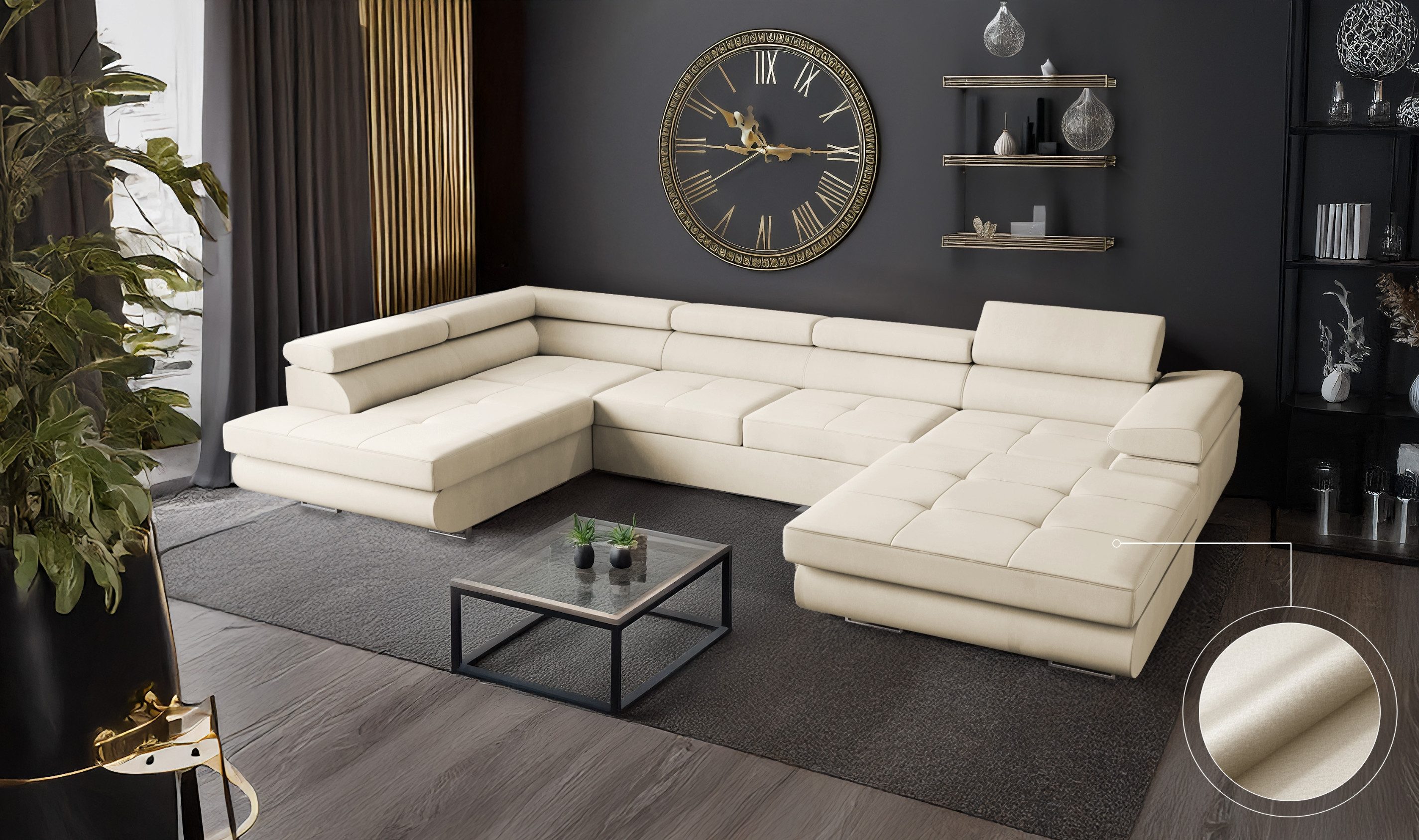 Das VENUS U Ecksofa mit Schlaffunktion und zwei Bettkästen ist ein stilvolles Komfortmöbelstück für alle, die Funktion, Platzangebot und modernes Design in einem Sofa vereint sehen möchten.