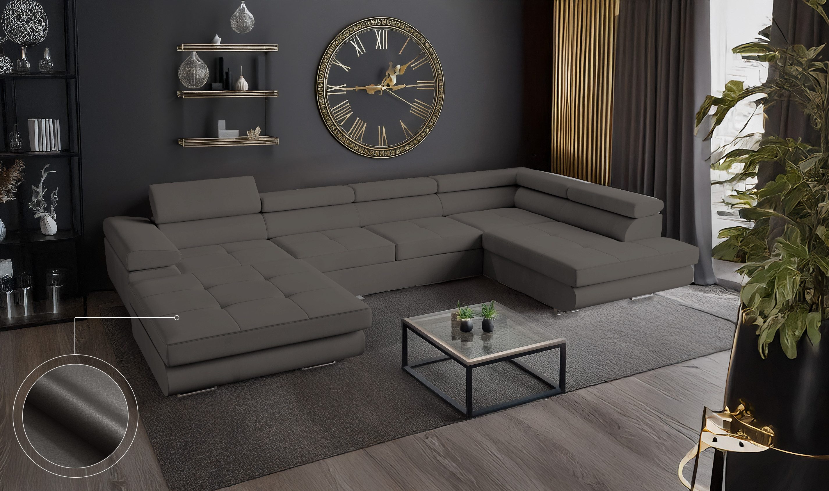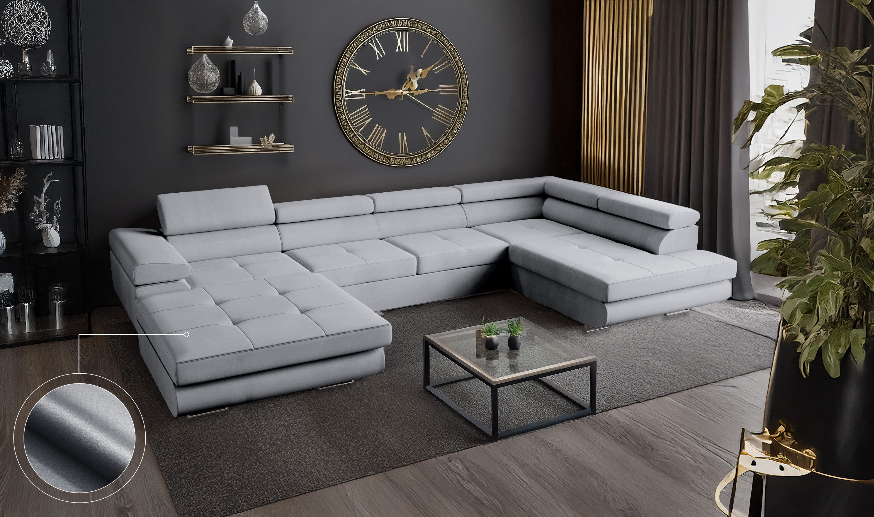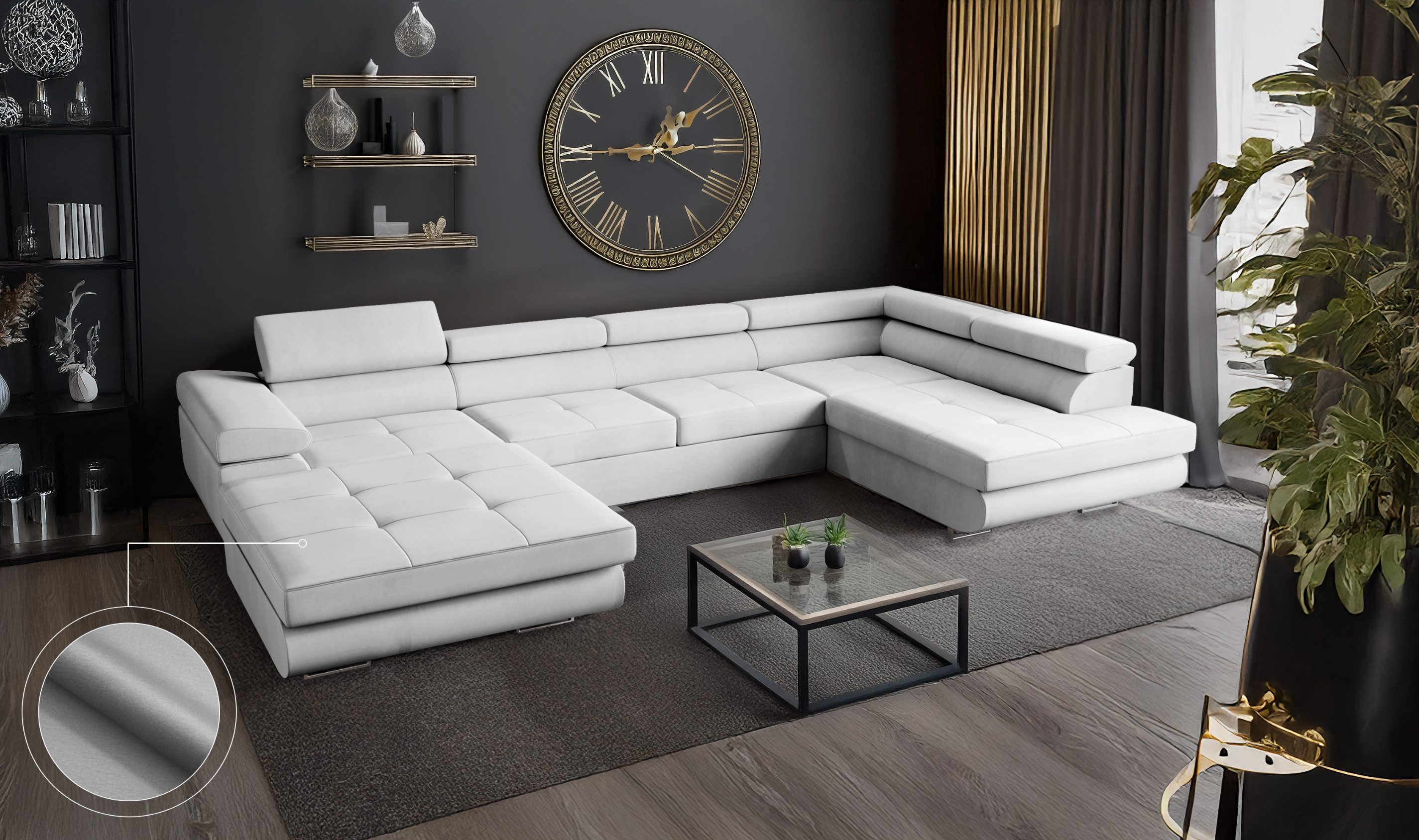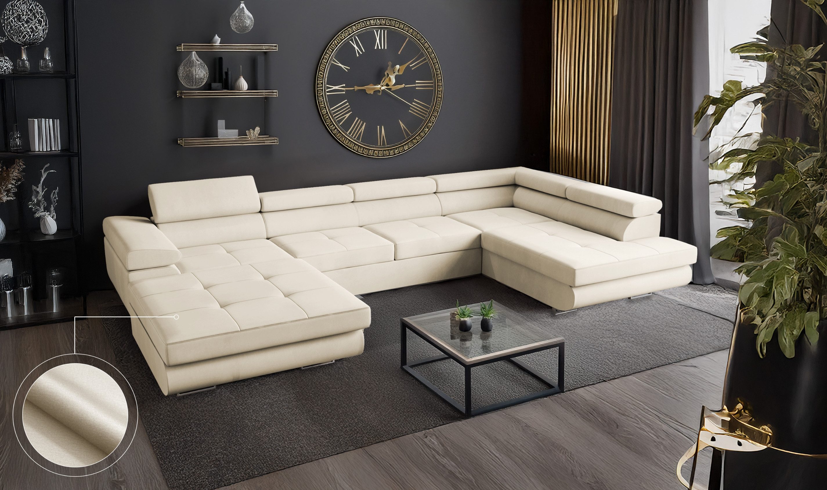 Das VENUS Ecksofa in U-Form ist mehr als nur eine Wohnlandschaft – es ist ein durchdachtes Komfortmöbelstück für anspruchsvolle Haushalte, das modernes Design mit praktischen Funktionen vereint. Mit ihrer großzügigen U-Form bietet die Couch besonders viel Platz und schafft eine kommunikative Wohlfühlzone für Familie, Freunde und Gäste.