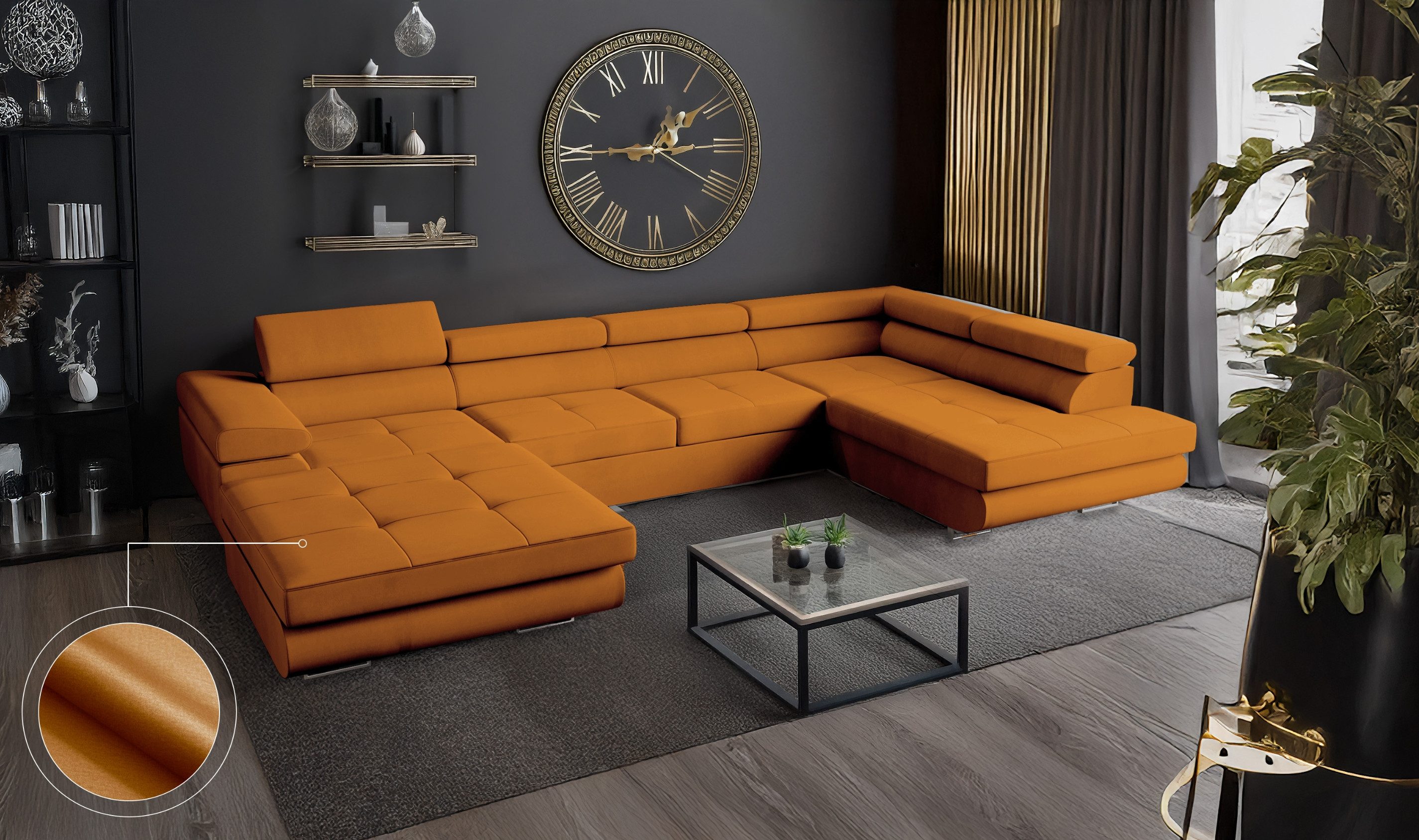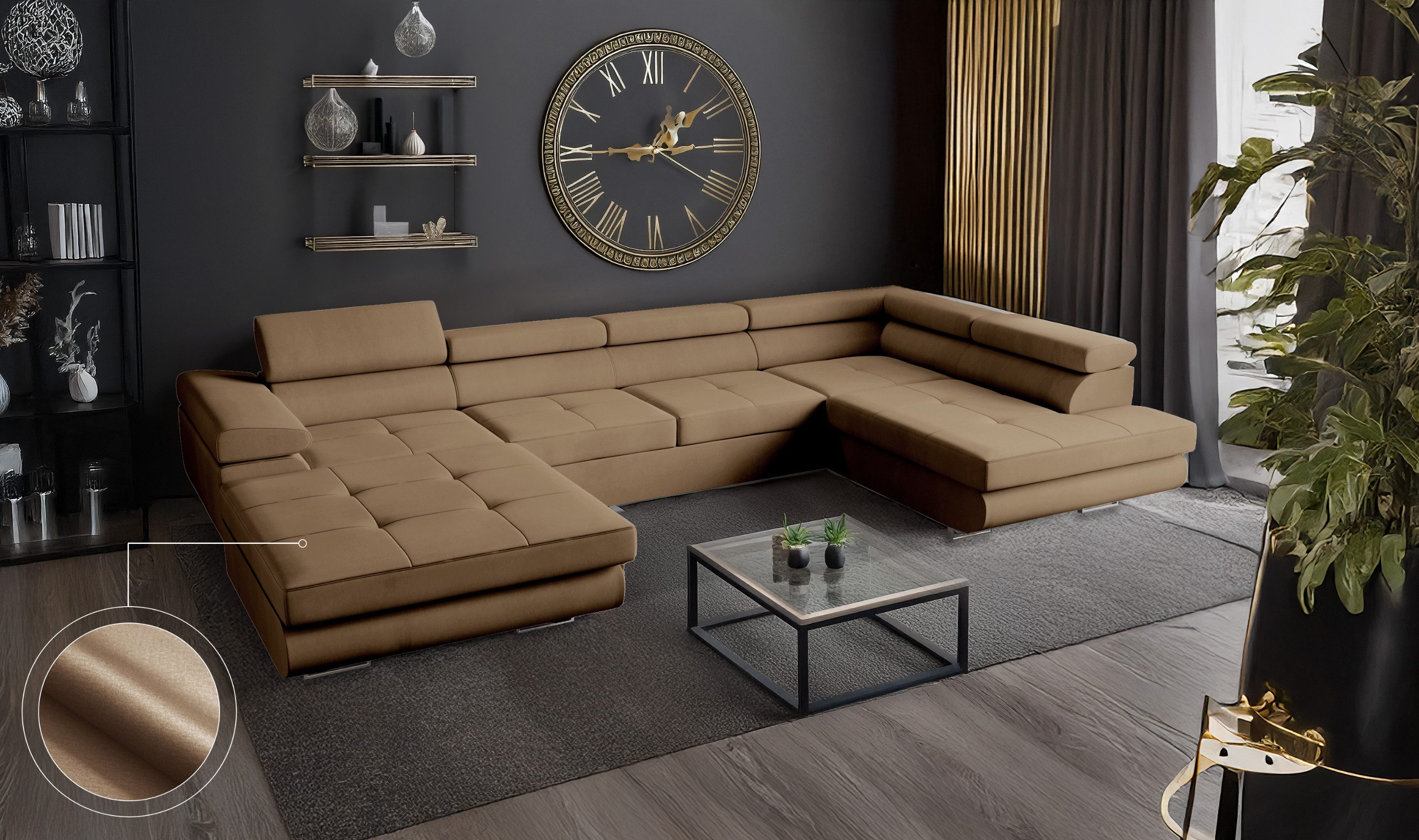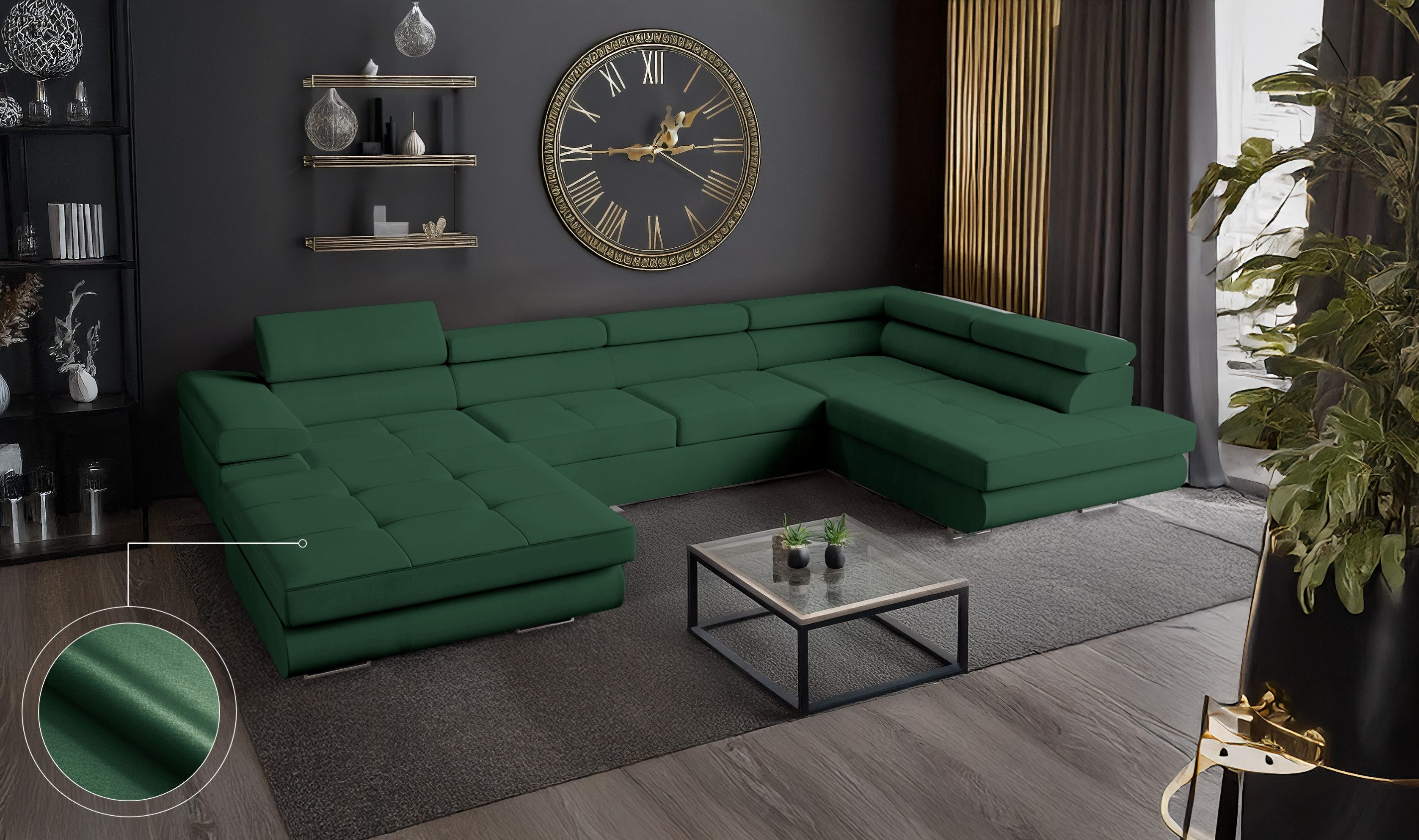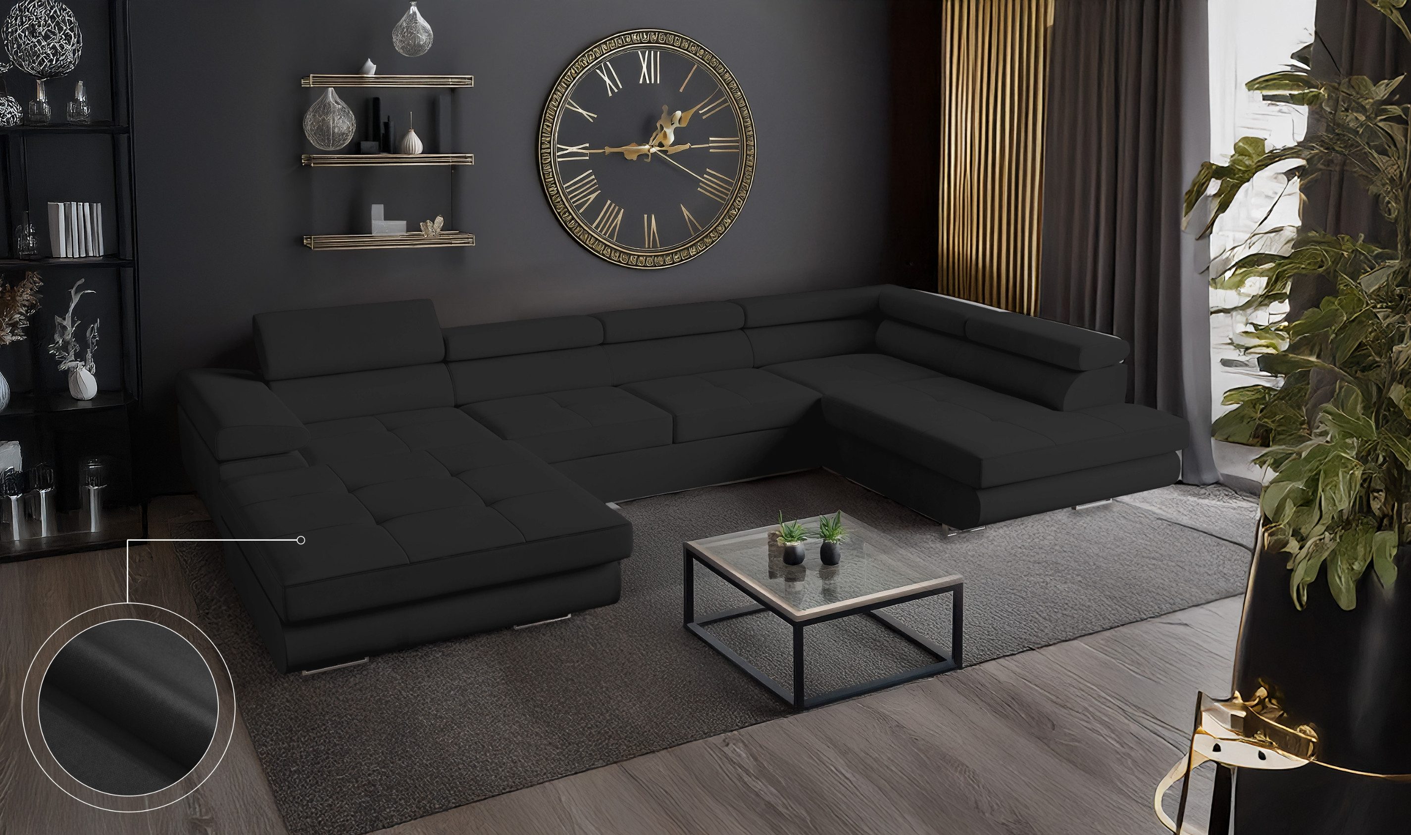 Das VENUS Ecksofa in U-Form ist mehr als nur eine Wohnlandschaft – es ist ein durchdachtes Komfortmöbelstück für anspruchsvolle Haushalte, das modernes Design mit praktischen Funktionen vereint. Mit ihrer großzügigen U-Form bietet die Couch besonders viel Platz und schafft eine kommunikative Wohlfühlzone für Familie, Freunde und Gäste.