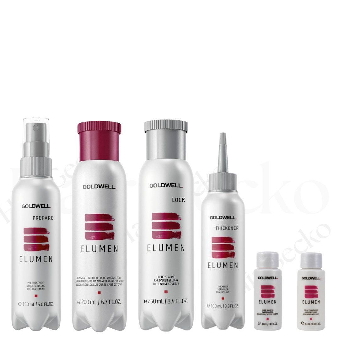 Goldwell Elumen Starter-Set – Salonqualität für zu Hause Das Goldwell Elumen Haarfarben Starter-Set bietet alles, was du für eine intensive, langanhaltende und strahlende Haarfarbe brauchst – direkt bei dir zu Hause! Die innovative Elumen Technologie ermöglicht leuchtende, multidimensionale Farben ohne Oxidation, schont das Haar und sorgt für eine außergewöhnliche Haltbarkeit. Das Set enthält: Elumen Prepare 150 ml – Bereitet das Haar optimal auf die Farbbehandlung vor. Elumen Haarfarbe 200 ml (Farbton frei wählbar) – Für brillante, langanhaltende Farbe mit außergewöhnlichem Glanz. Elumen Lock 250 ml – Versiegelt die Farbpigmente für maximale Haltbarkeit. Elumen Thickener 100 ml – Ermöglicht eine individuelle Anpassung der Konsistenz für präzises Auftragen. Dazu bekommt ihr gratis: 1x Elumen Color Care Shampoo (30 ml) – Sanfte Reinigung zur Farberhaltung. 1x Elumen Care Conditioner (30 ml) – Pflegt das Haar und verstärkt die Farbbrillanz. Ohne Oxidation – Schonend für das Haar Vegan & ammoniakfrei Extrem leuchtende Farben mit langer Haltbarkeit Perfekt für alle, die ihre Haarfarbe intensivieren, auffrischen oder kreativ verändern möchten – und das mit professionellen Ergebnissen!