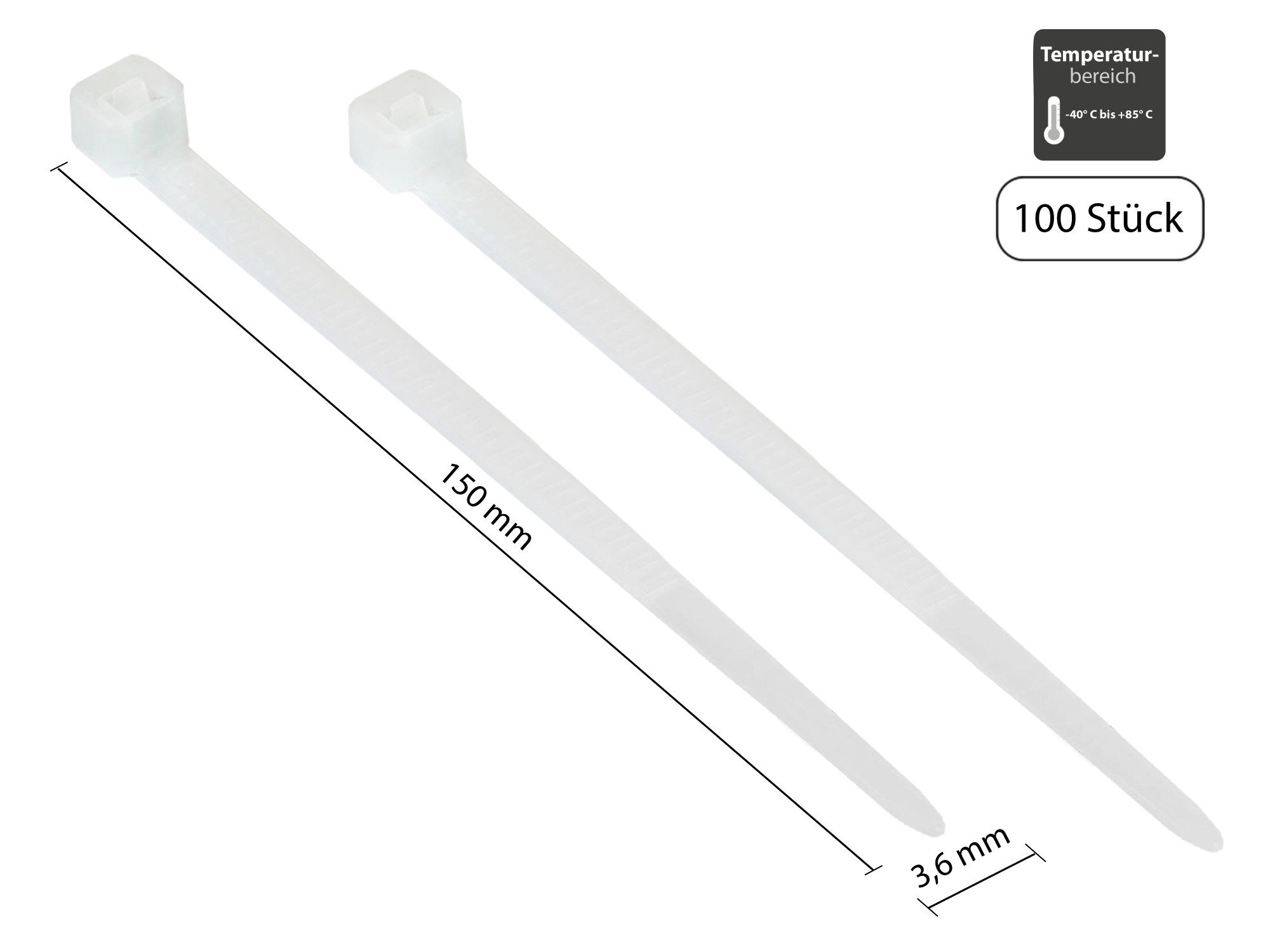 - Material: Nylon PA 66 - Bündeldurchmesser: 2 - 35 mm - Zugfestigkeit: bis 18 kg - Feuerwiderstandsklasse: 94V-2 - Einsatztemperatur: -40 °C bis +85 °C - Einmal verwendbar - Packungsinhalt: 100 Stück